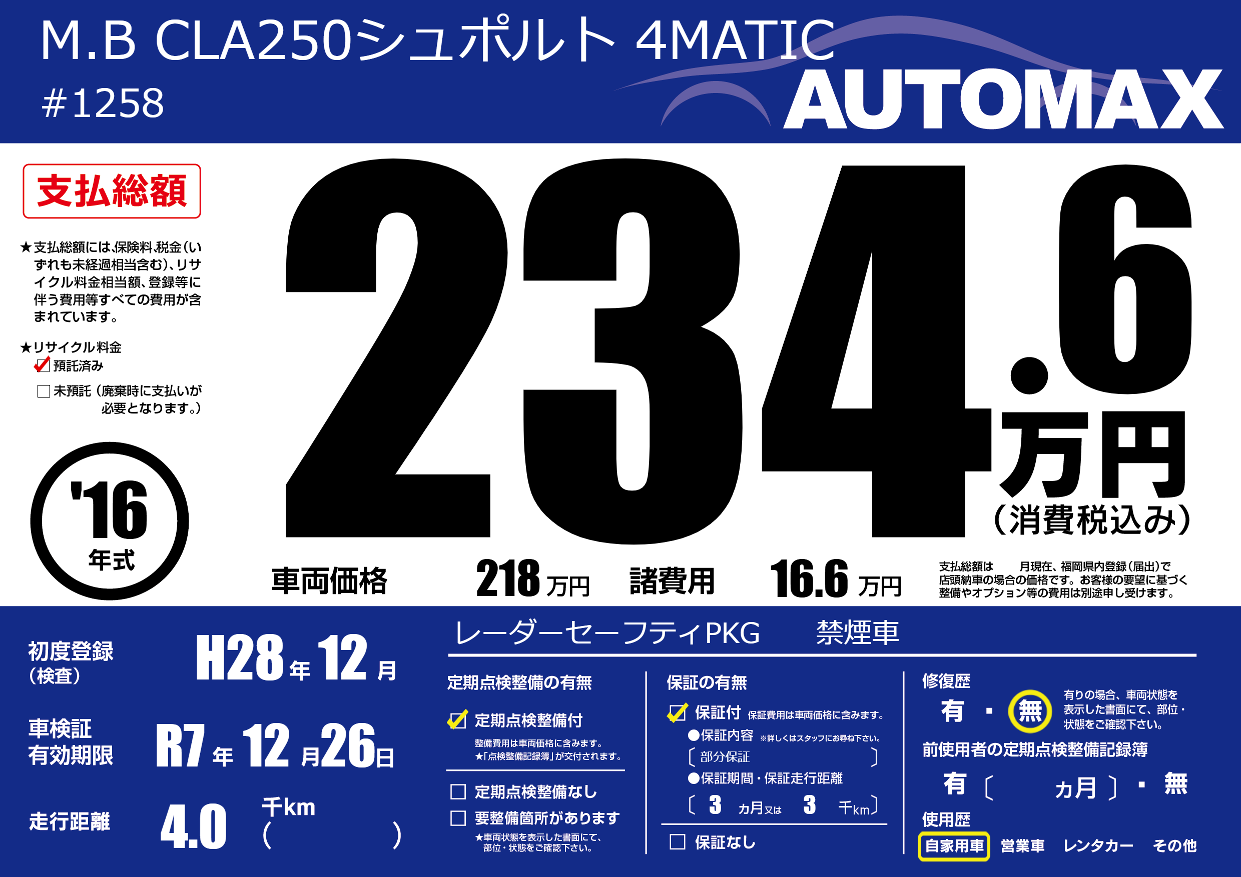 | 車名 | M.B CLA250シュポルト 4MATIC | グレード ミッション 排気量 |