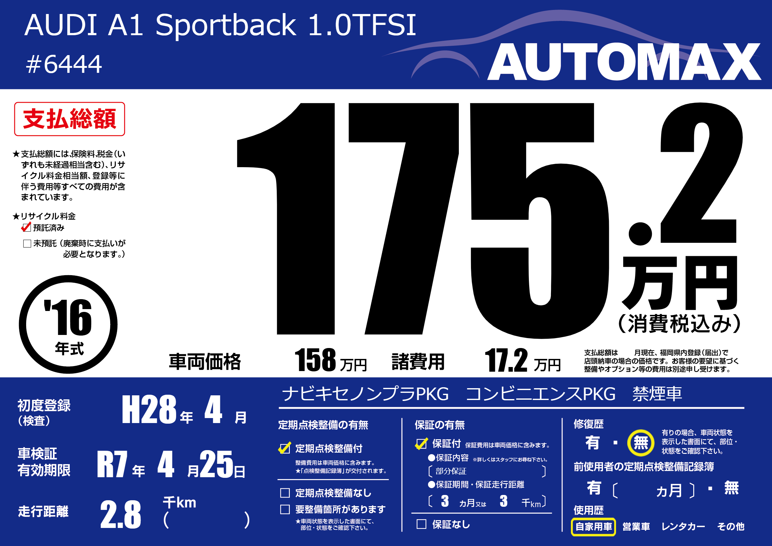 | 車名 | AUDI A1 Sportback 1.0TFSI | グレード ミッション 排気量 |