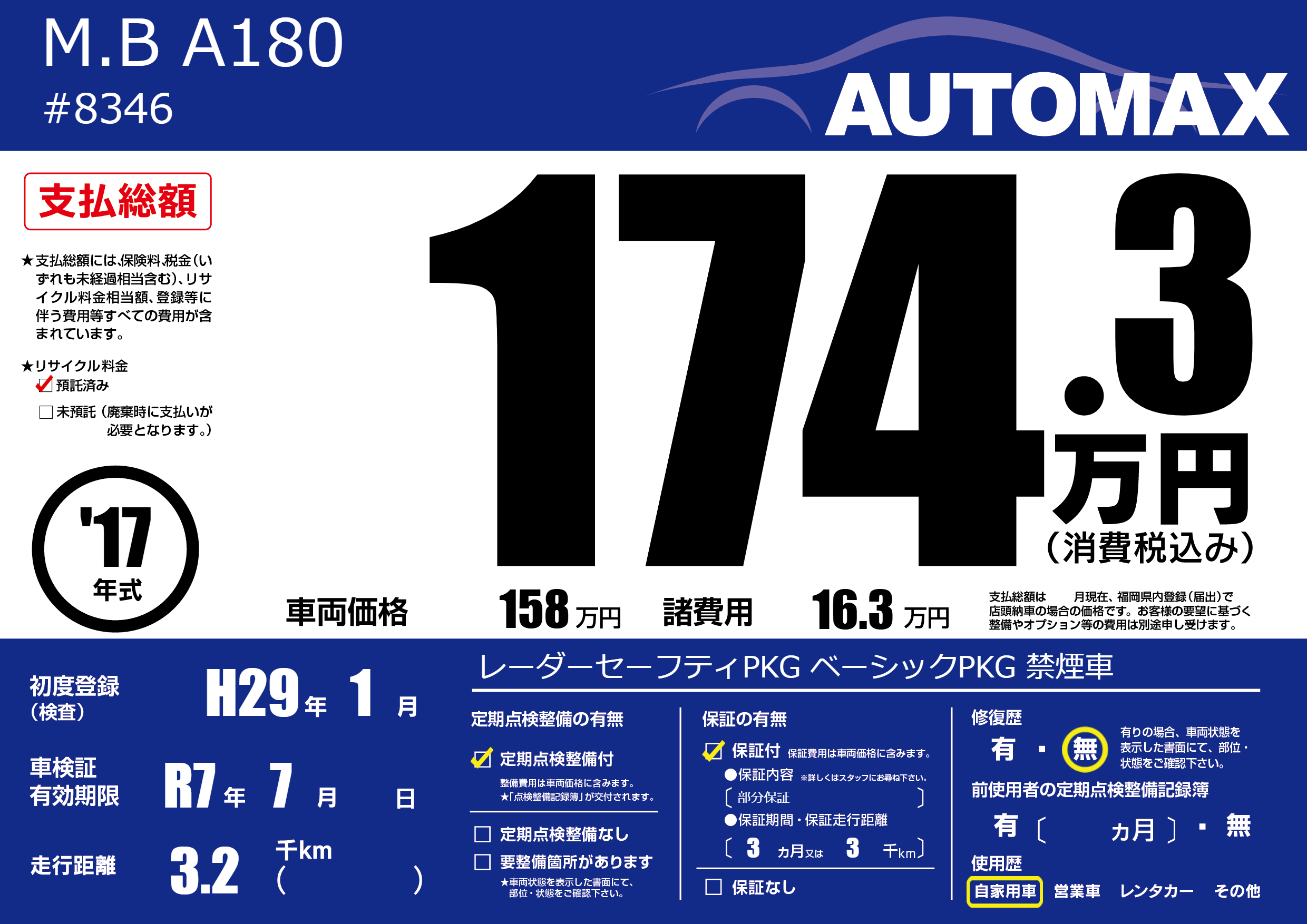 | 車名 | M.B A180 | グレード ミッション 排気量 |