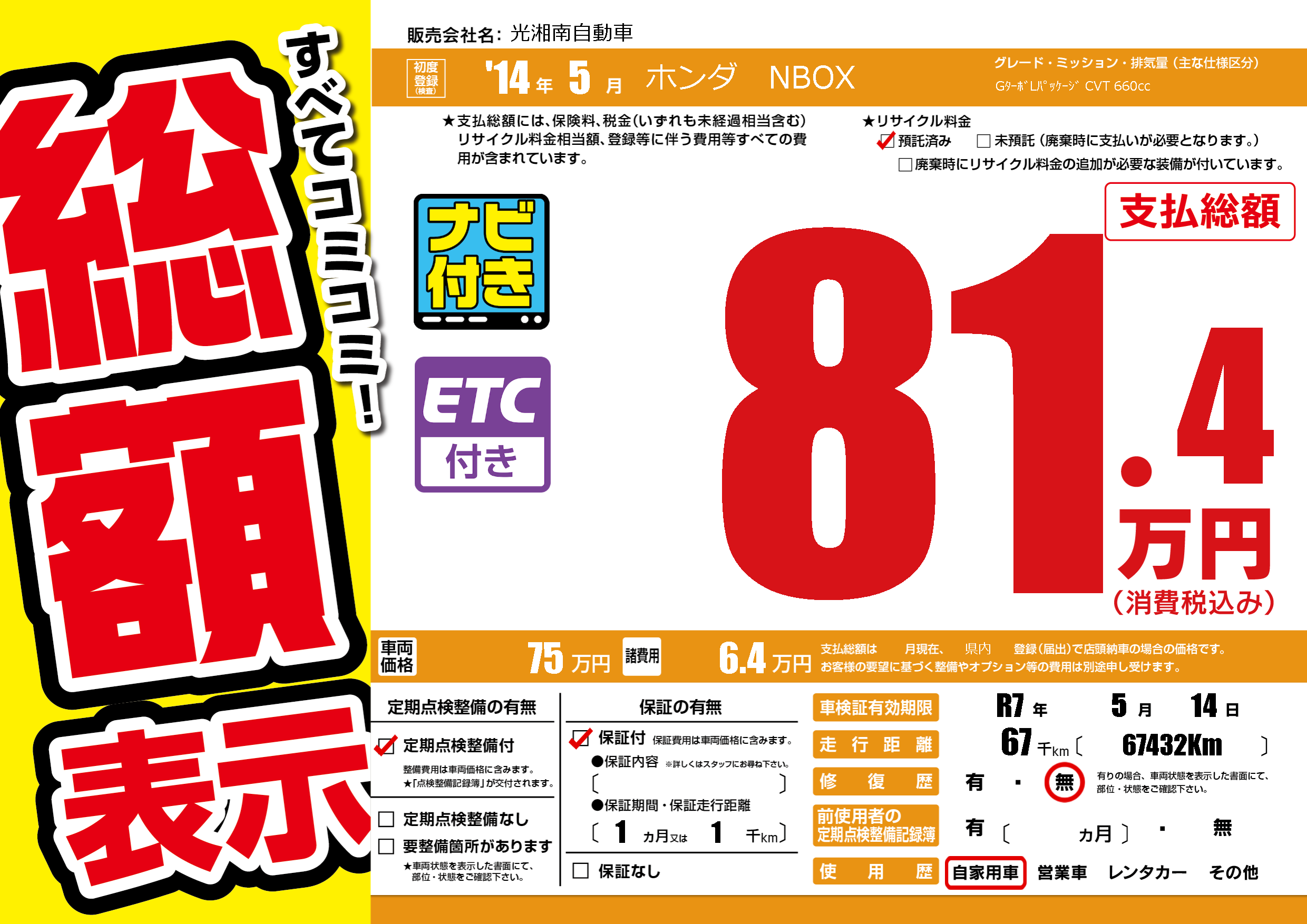 | 車名 | ホンダ NBOX | グレード ミッション 排気量 |