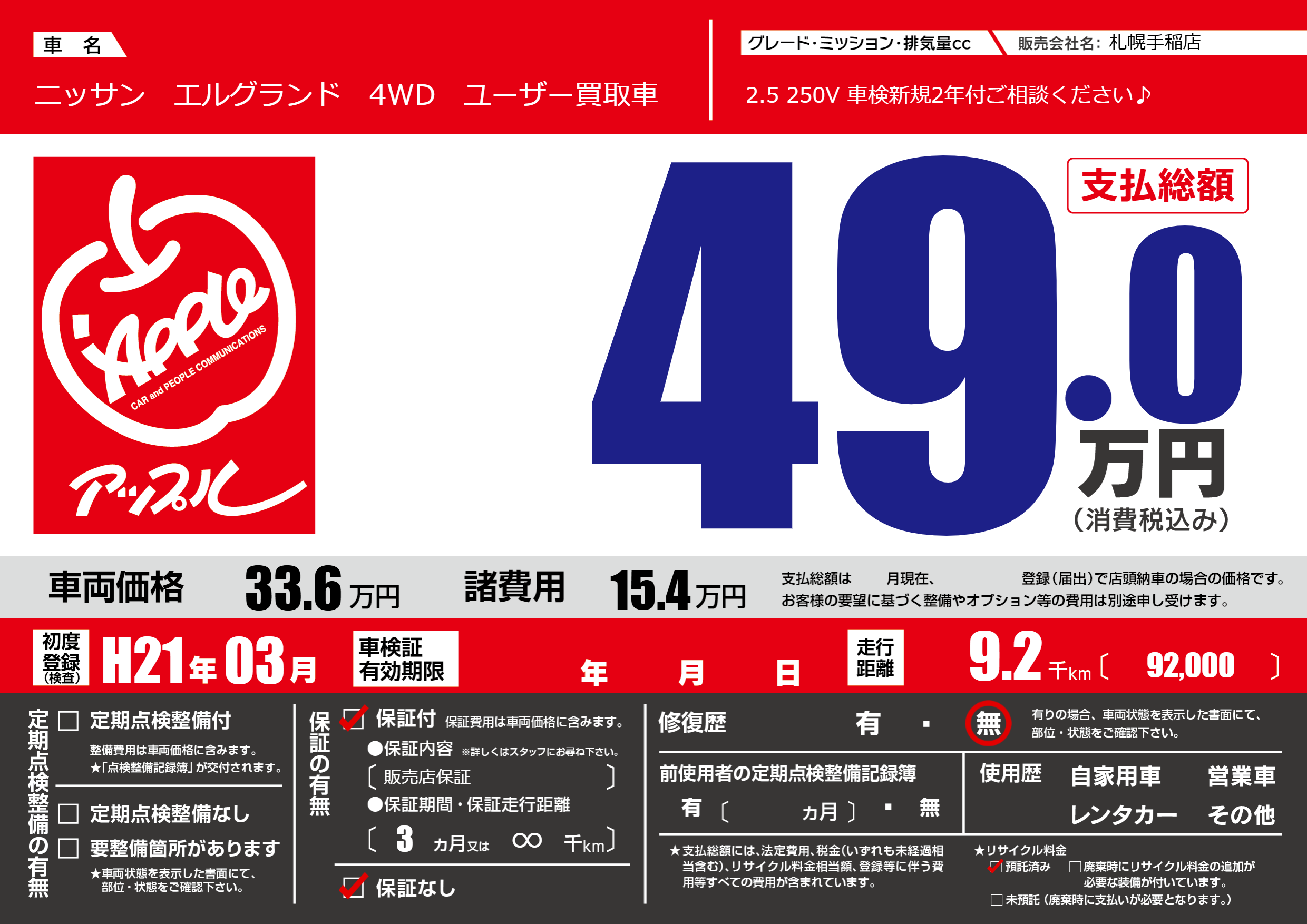 | 車名 | ニッサン エルグランド 4WD ユーザー買取車 | グレード ミッション 排気量 |