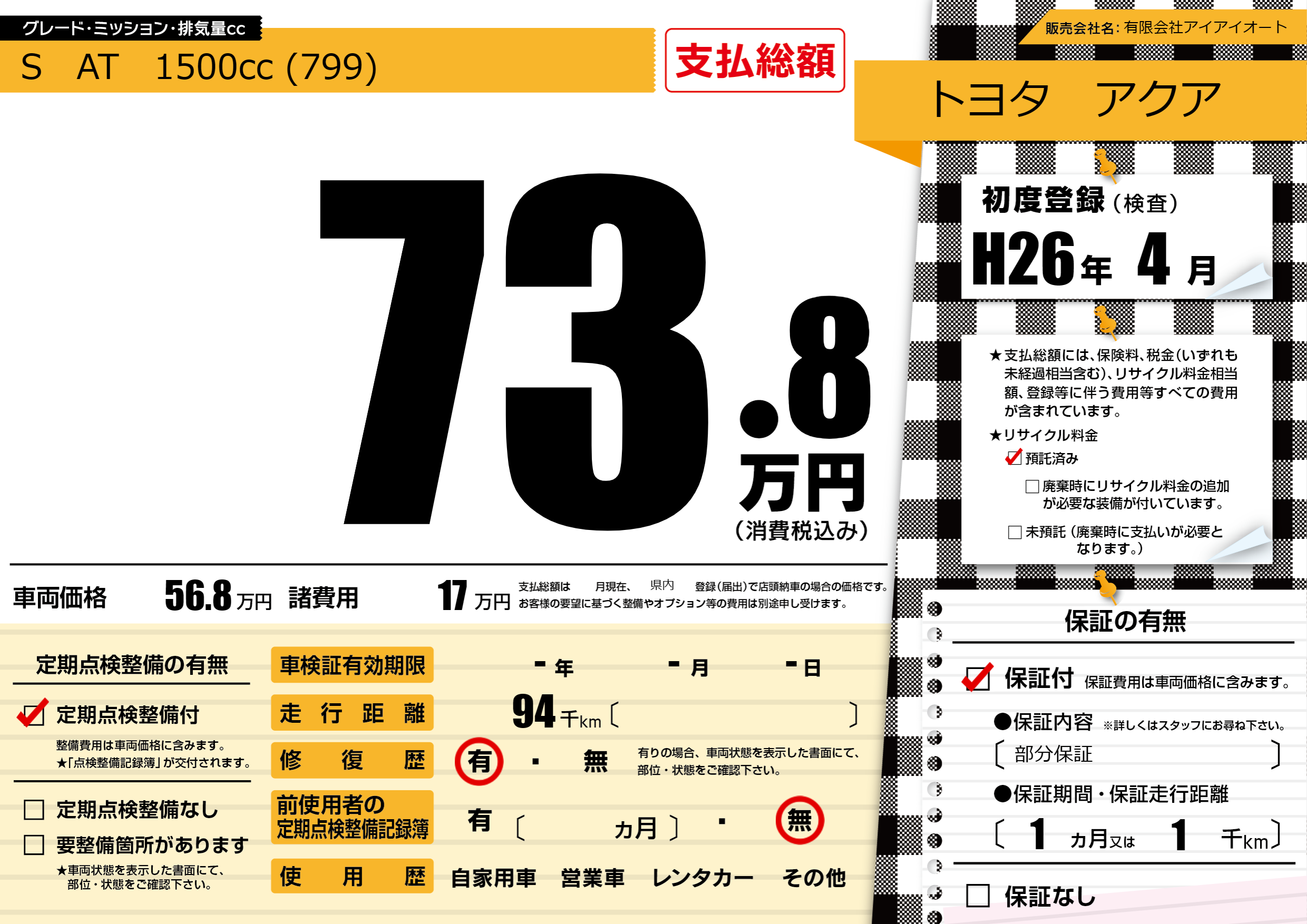 | 車名 | トヨタ アクア | グレード ミッション 排気量 |