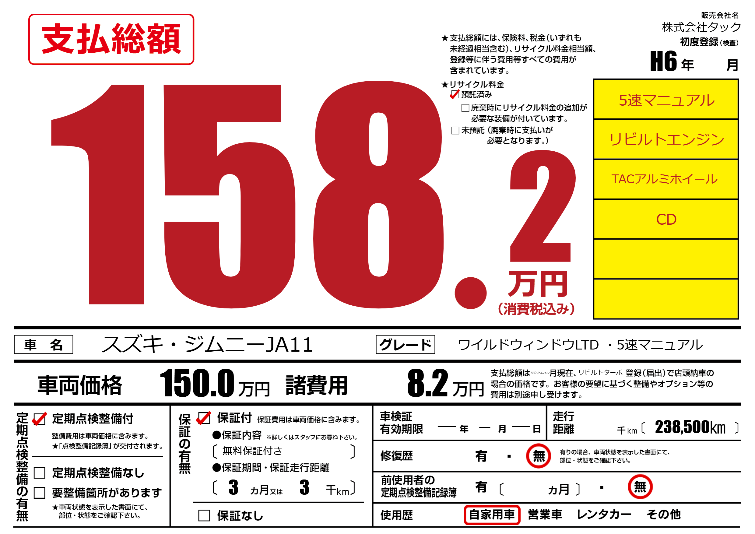 | 車名 | スズキ・ジムニーJA11 | グレード ミッション 排気量 |