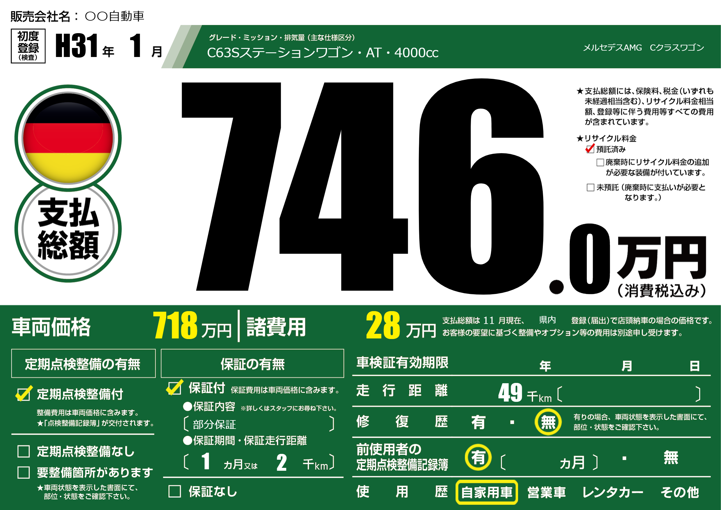 | 車名 | メルセデスAMG Cクラスワゴン | グレード ミッション 排気量 |