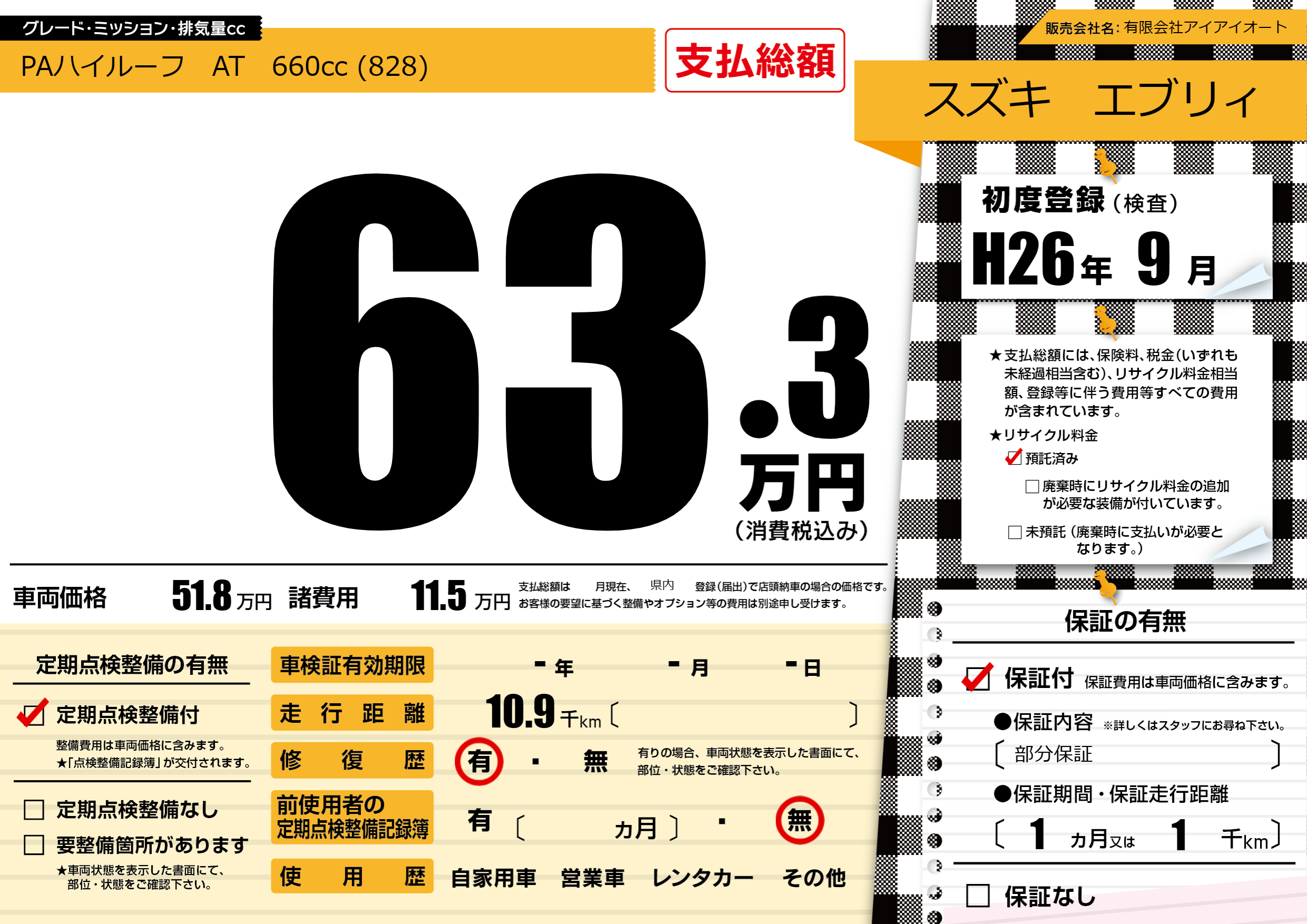 | 車名 | スズキ エブリィ | グレード ミッション 排気量 |