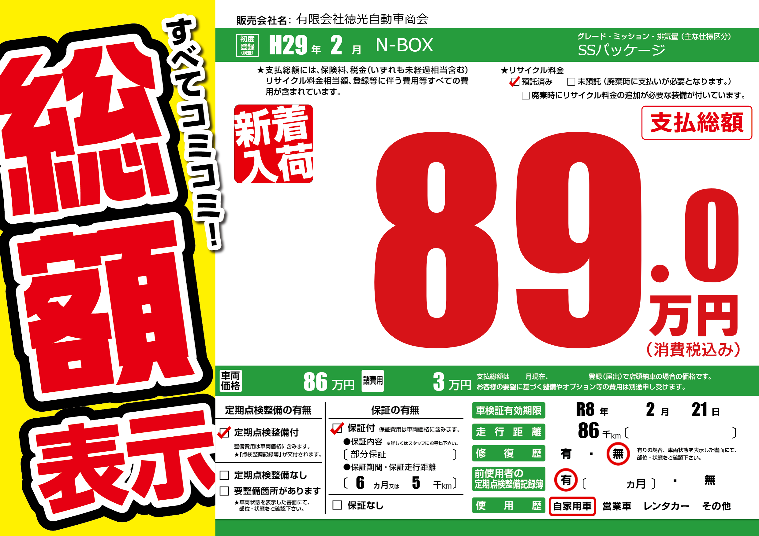 | 車名 | N-BOX | グレード ミッション 排気量 |
