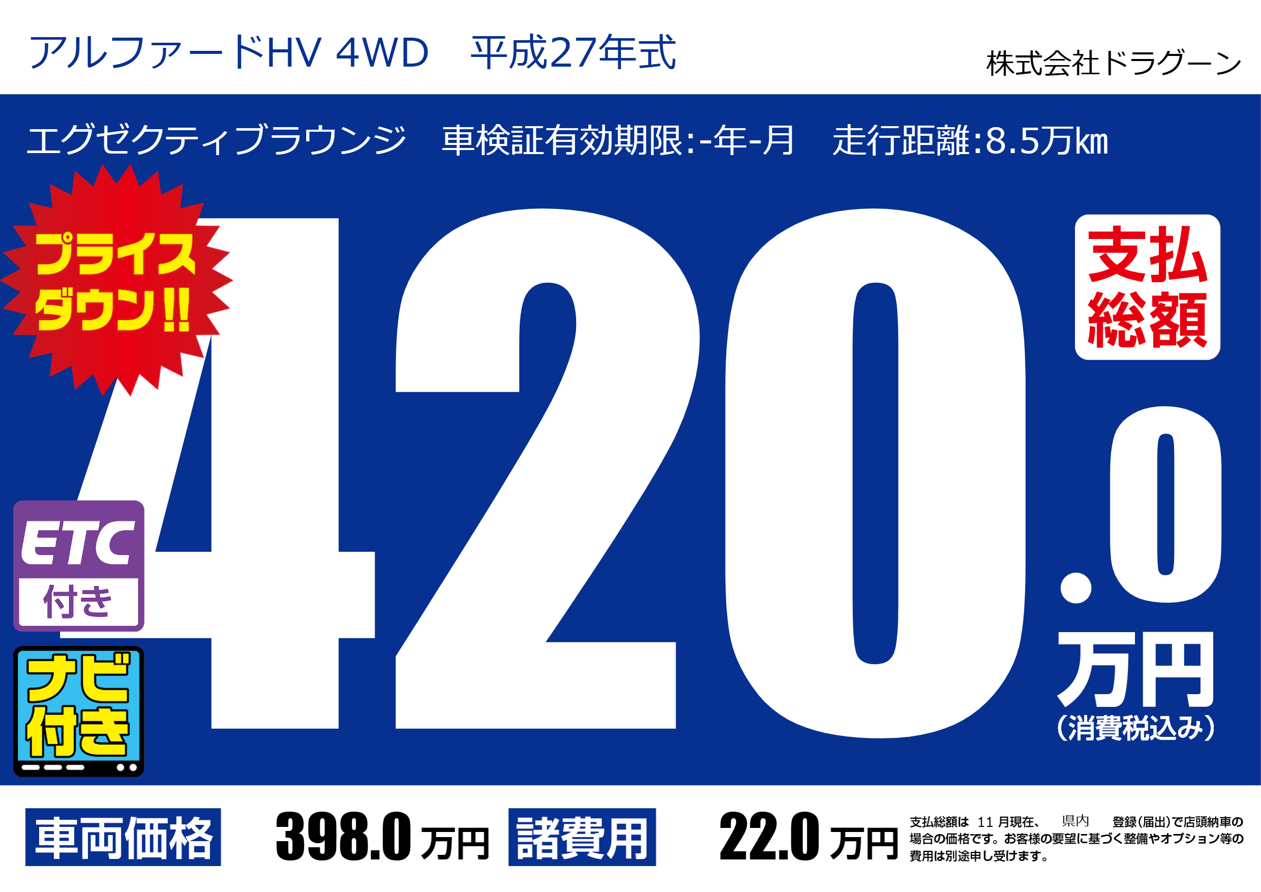| 車名 | アルファードHV 4WD 平成27年式 | グレード ミッション 排気量 |
