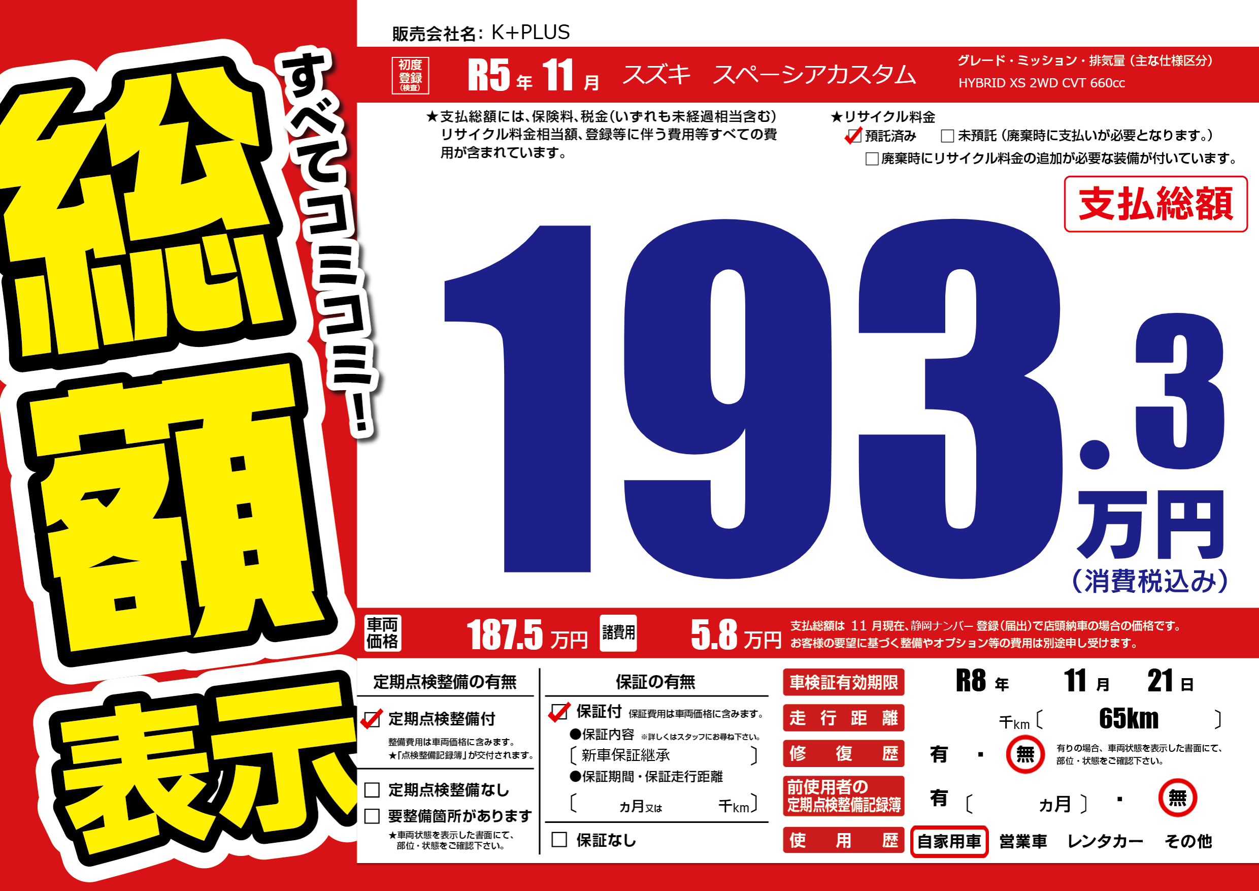 | 車名 | スズキ スペーシアカスタム | グレード ミッション 排気量 |