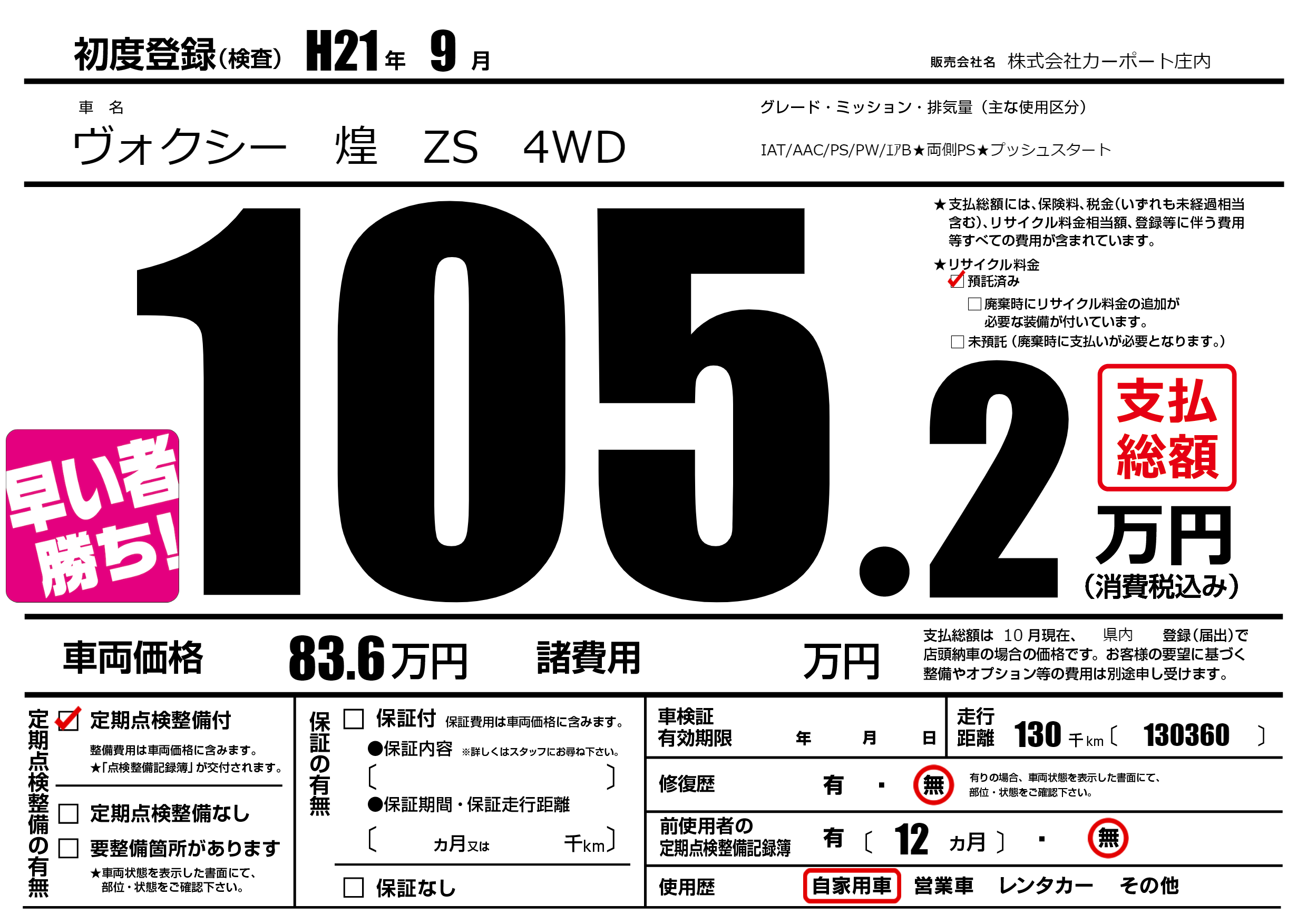 | 走行キロ | 13万km | 初年度登録 | H21年9月 |