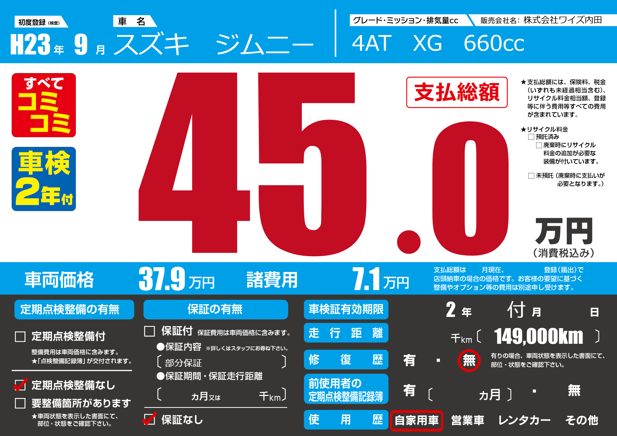 | 車名 | スズキ ジムニー | グレード ミッション 排気量 |