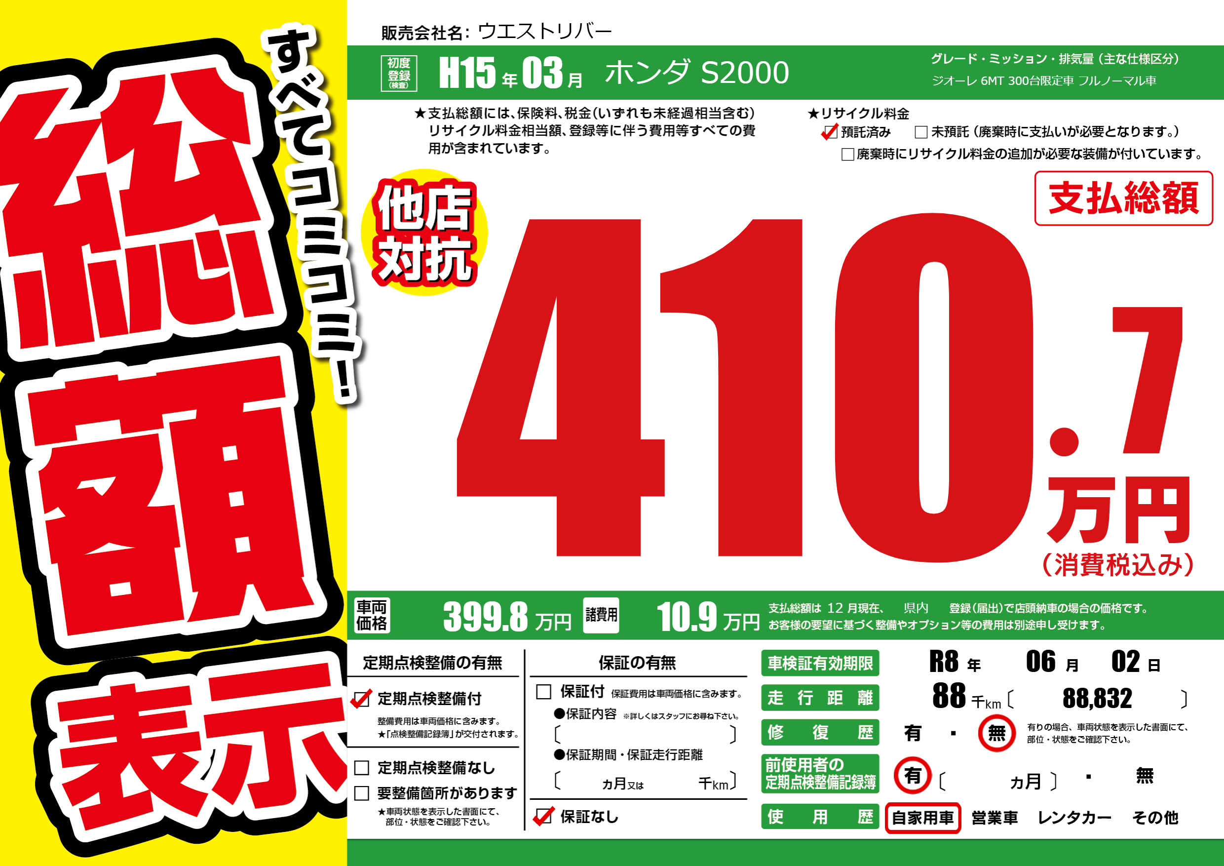 | 車名 | ホンダ S2000 | グレード ミッション 排気量 |