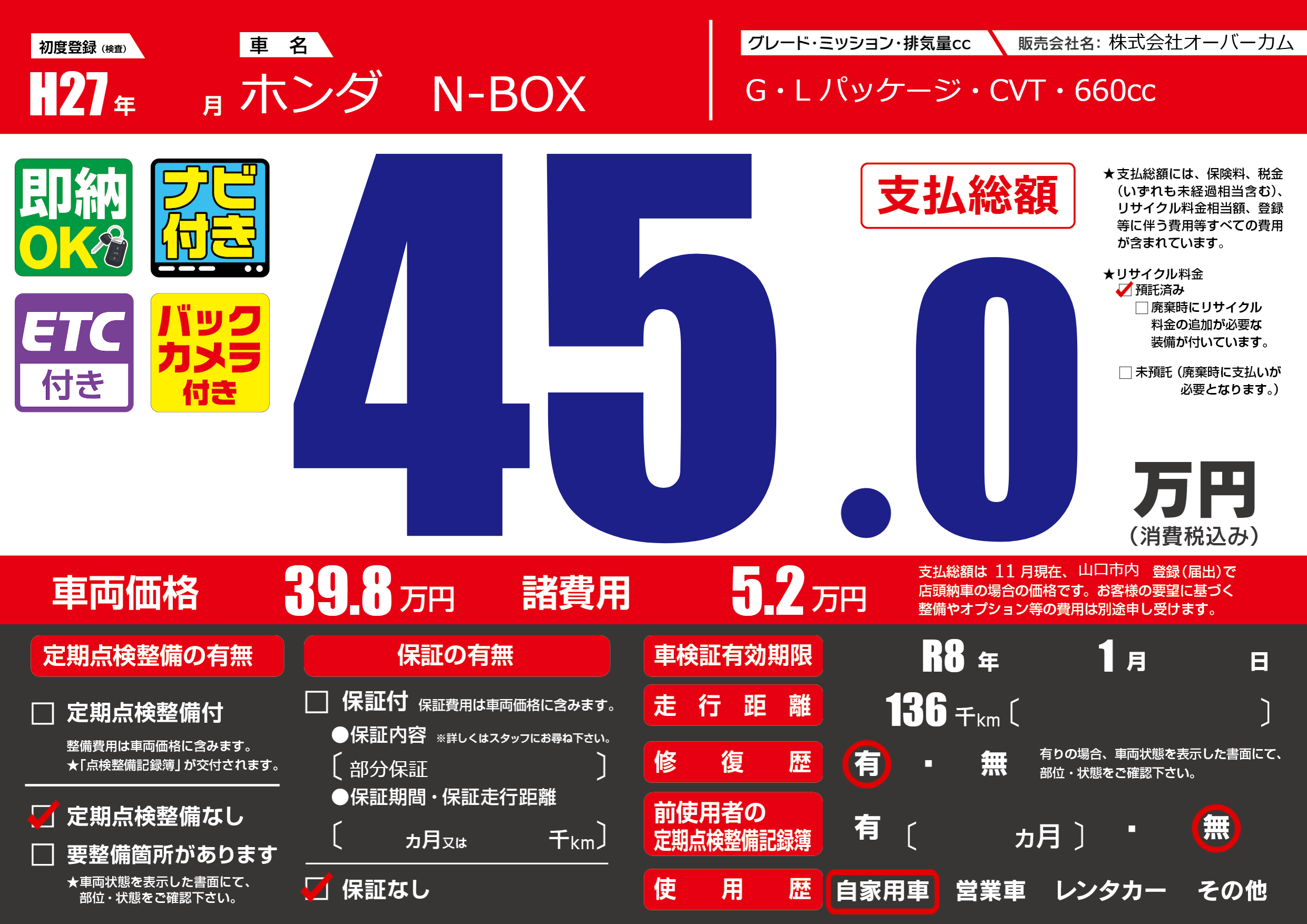| 車名 | ホンダ N-BOX | グレード ミッション 排気量 |