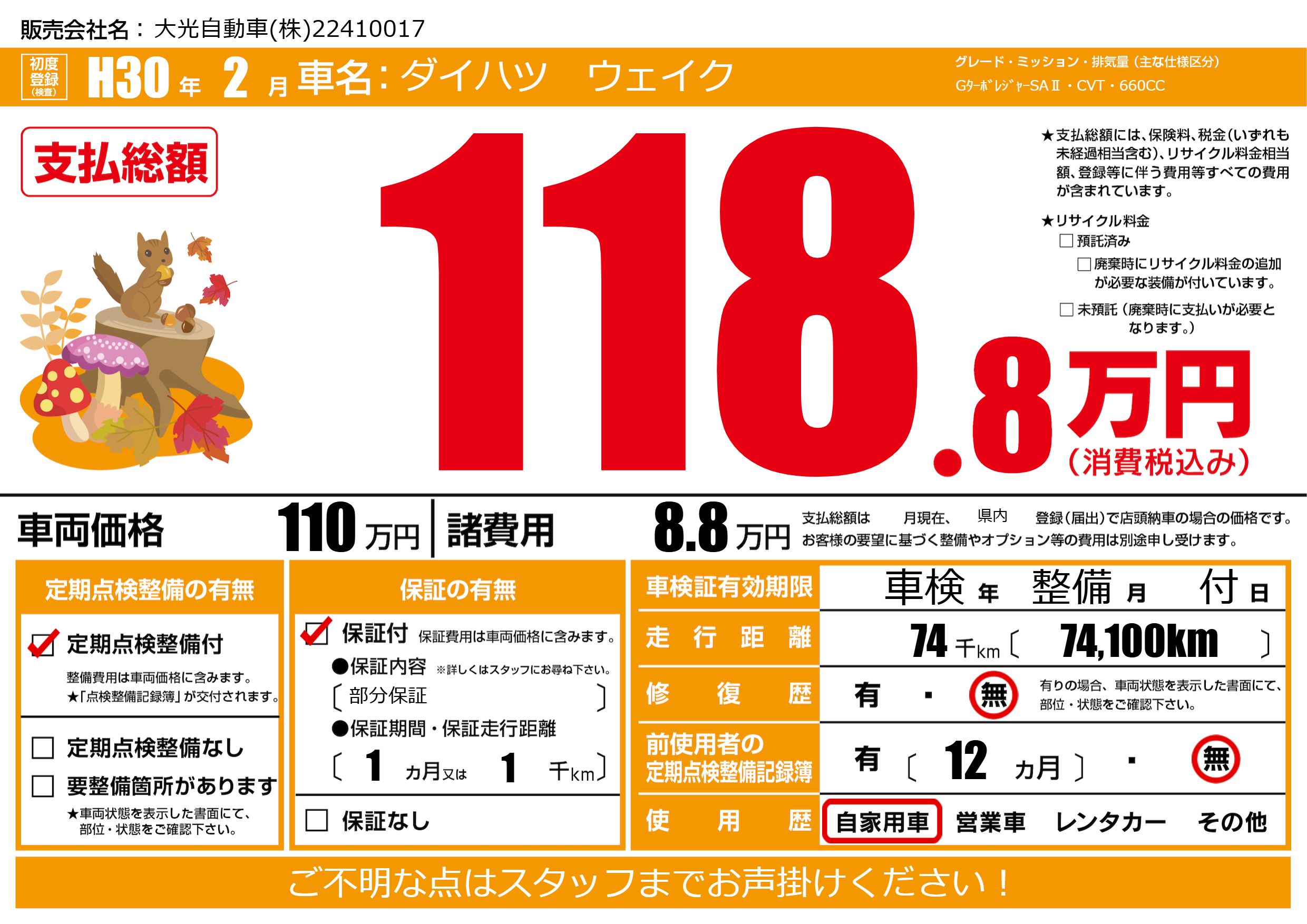 | 車名 | ダイハツ ウェイク | グレード ミッション 排気量 |