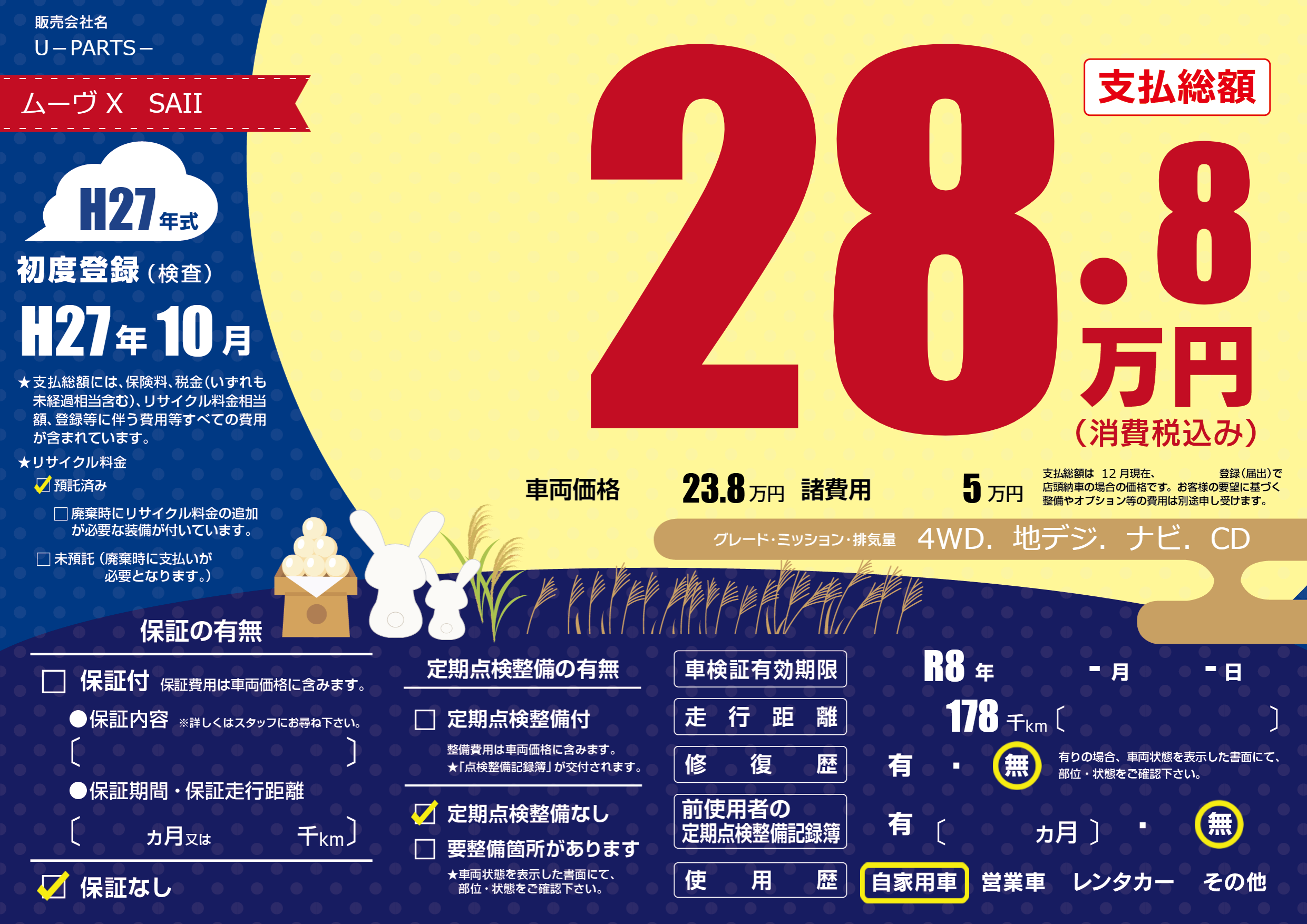 | 車名 | ムーヴ X SAII | グレード ミッション 排気量 |