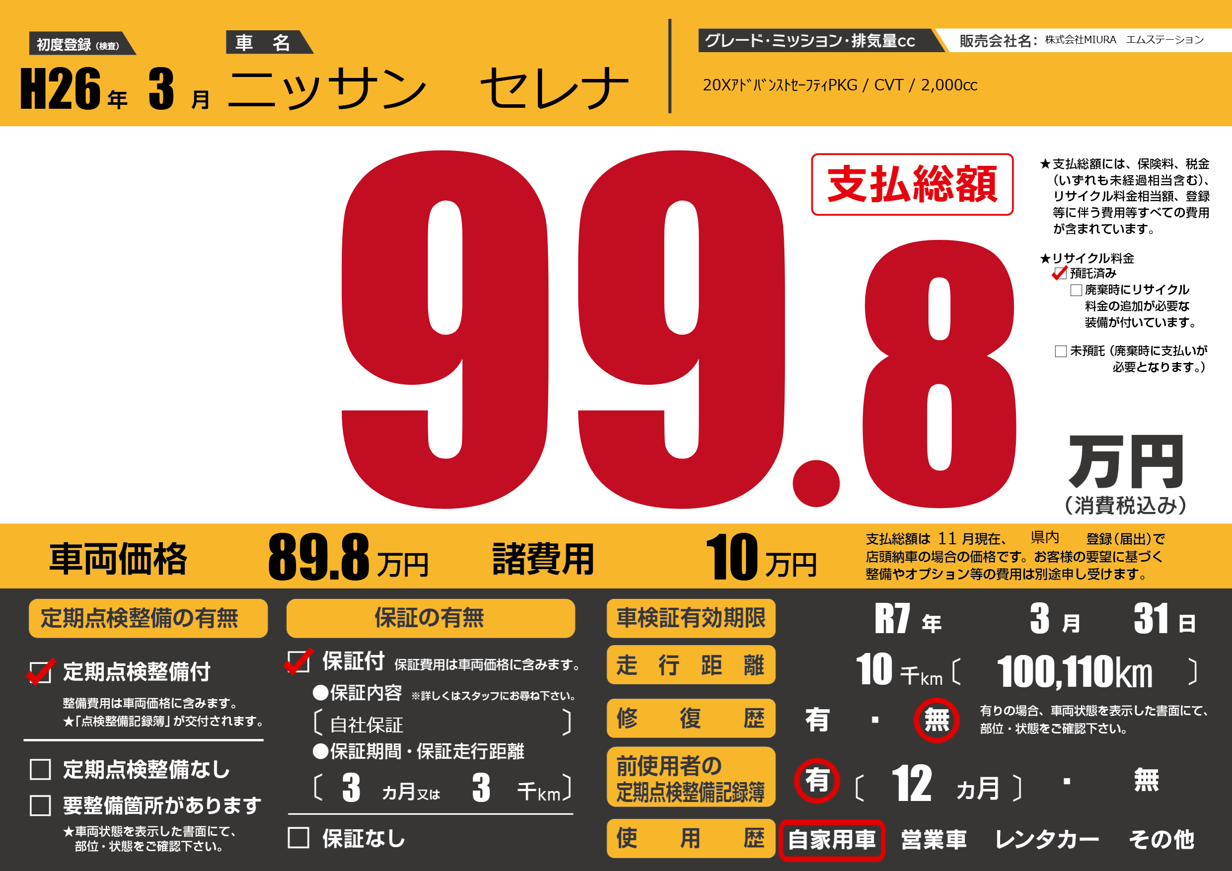 保証付き 保証内容(自社保証) 3ヶ月または3千km |