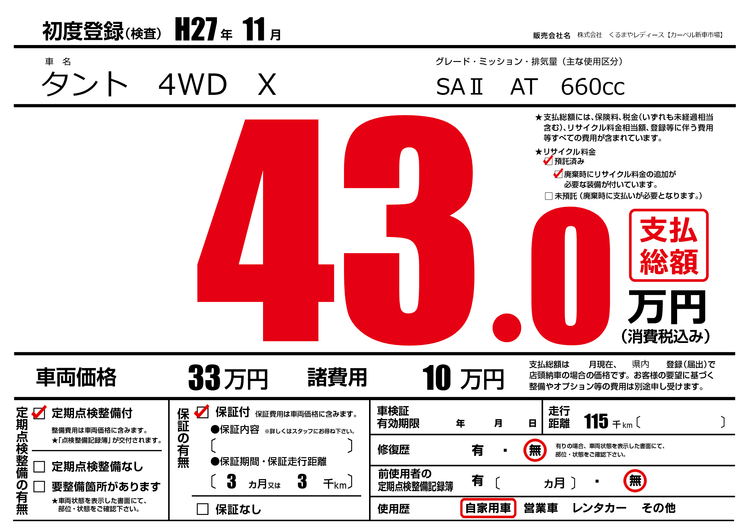 | 車名 | タント 4WD X | グレード ミッション 排気量 |