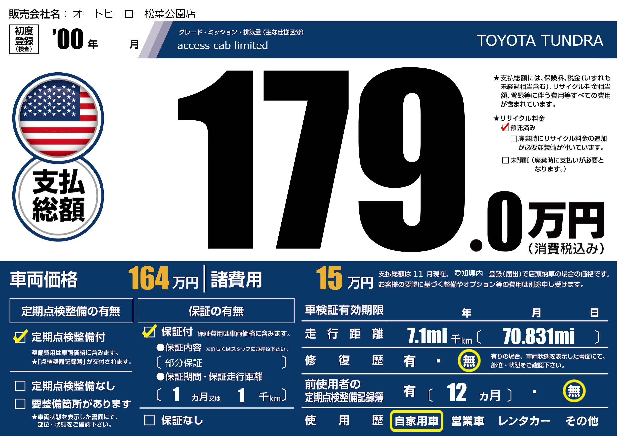 | 車名 | TOYOTA TUNDRA | グレード ミッション 排気量 |