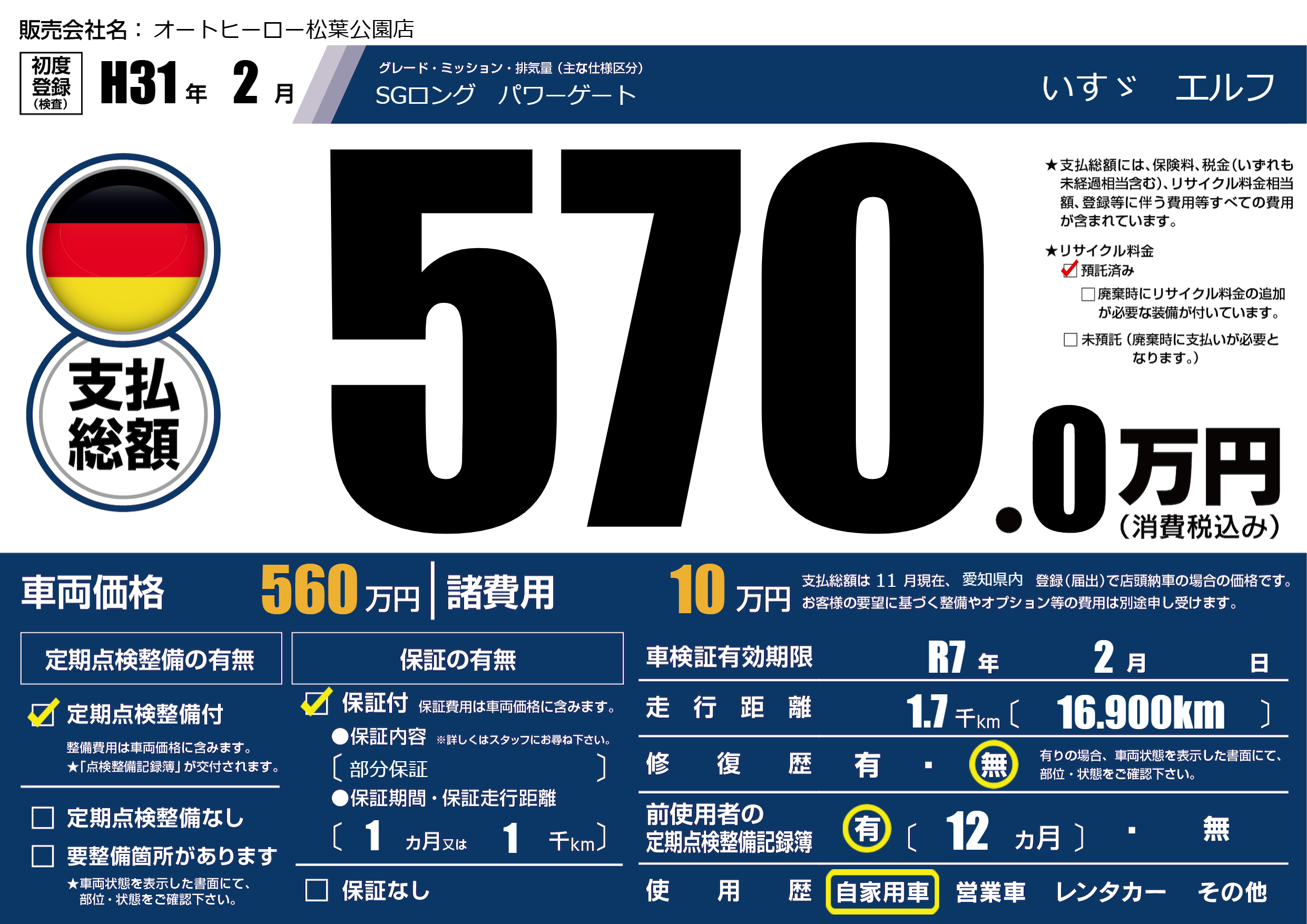 | 車検制限 | R7年 2月 - 日 | ||
