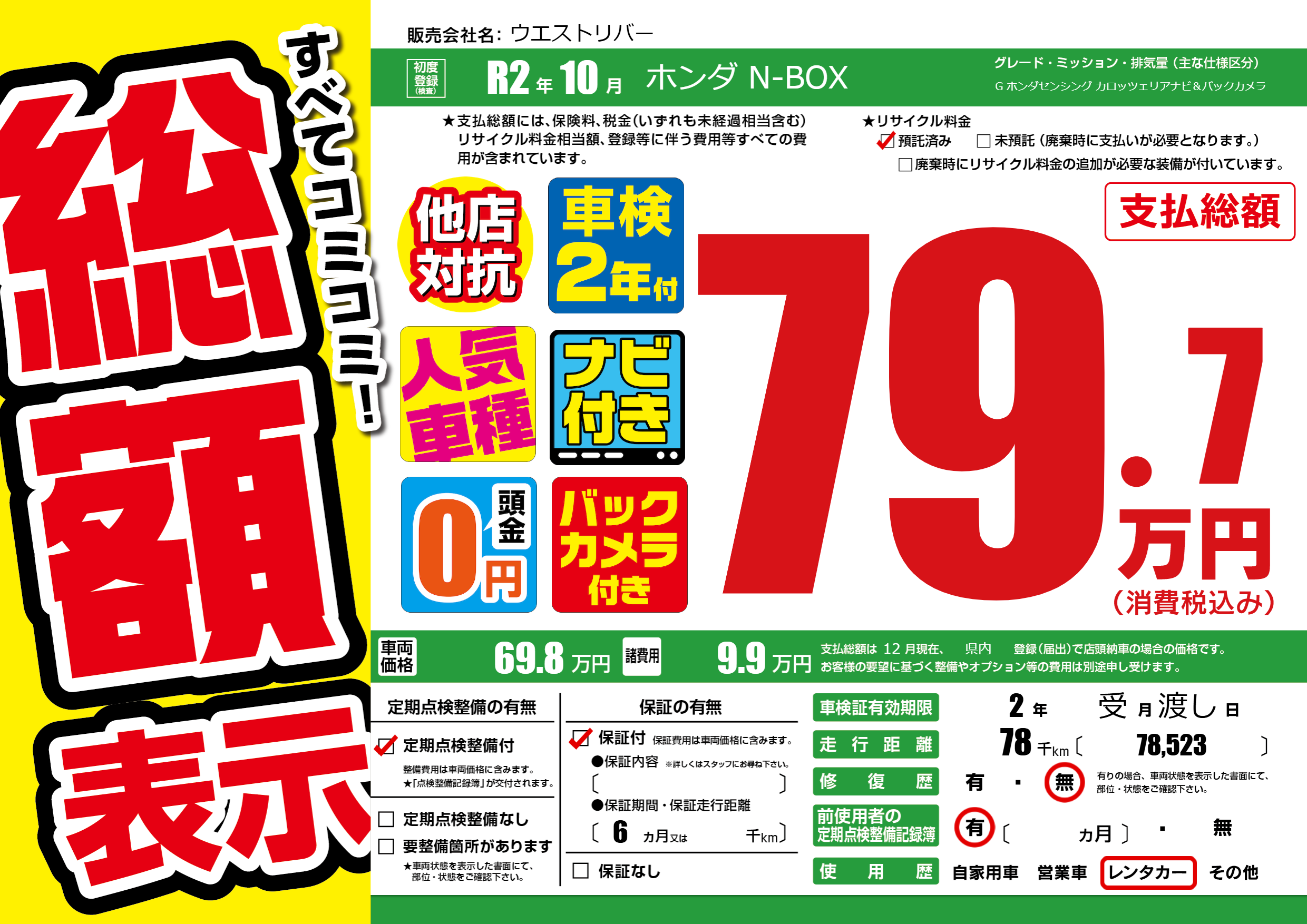 | 車名 | ホンダ N-BOX | グレード ミッション 排気量 |