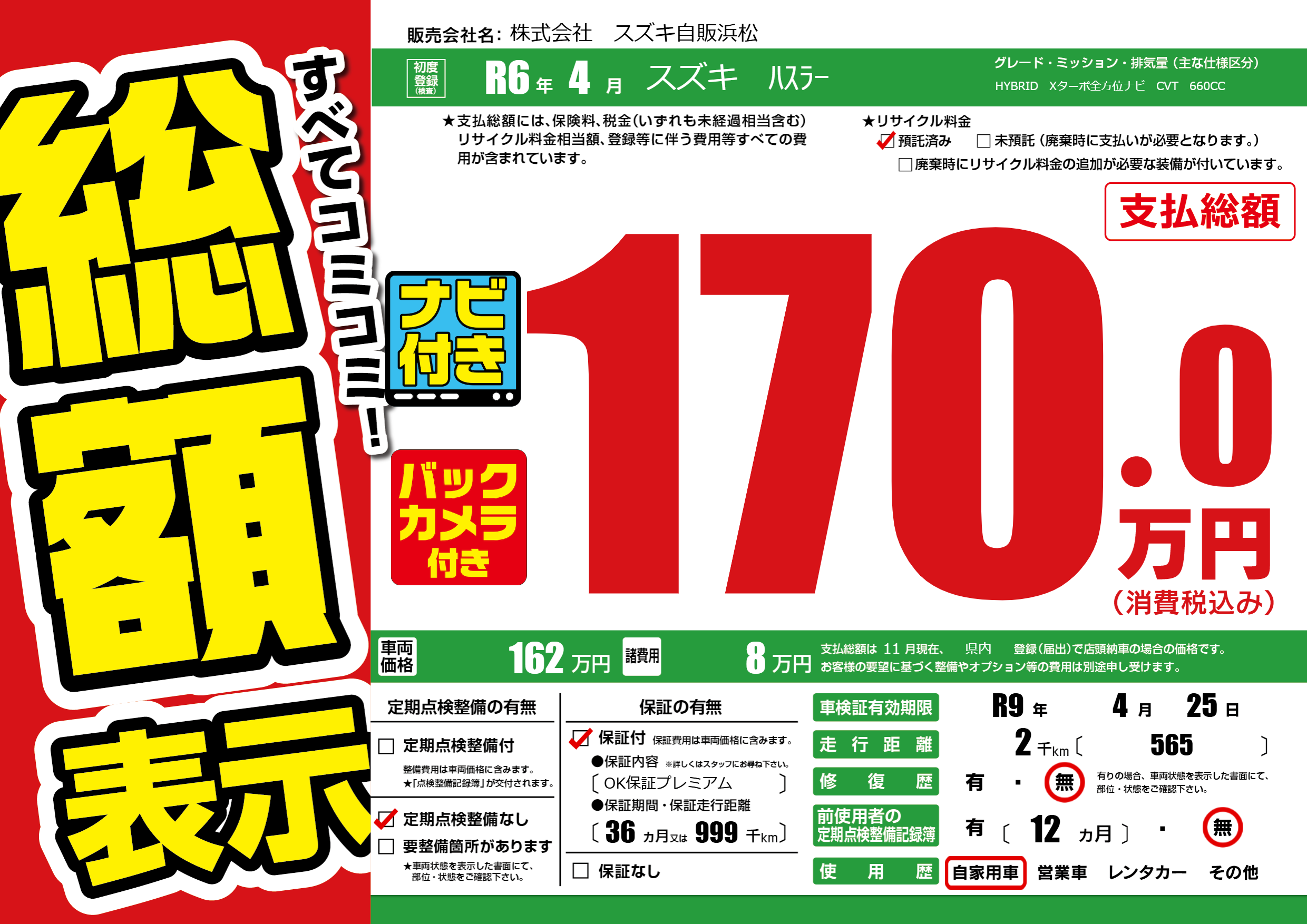 | 車名 | スズキ ハスラー | グレード ミッション 排気量 |