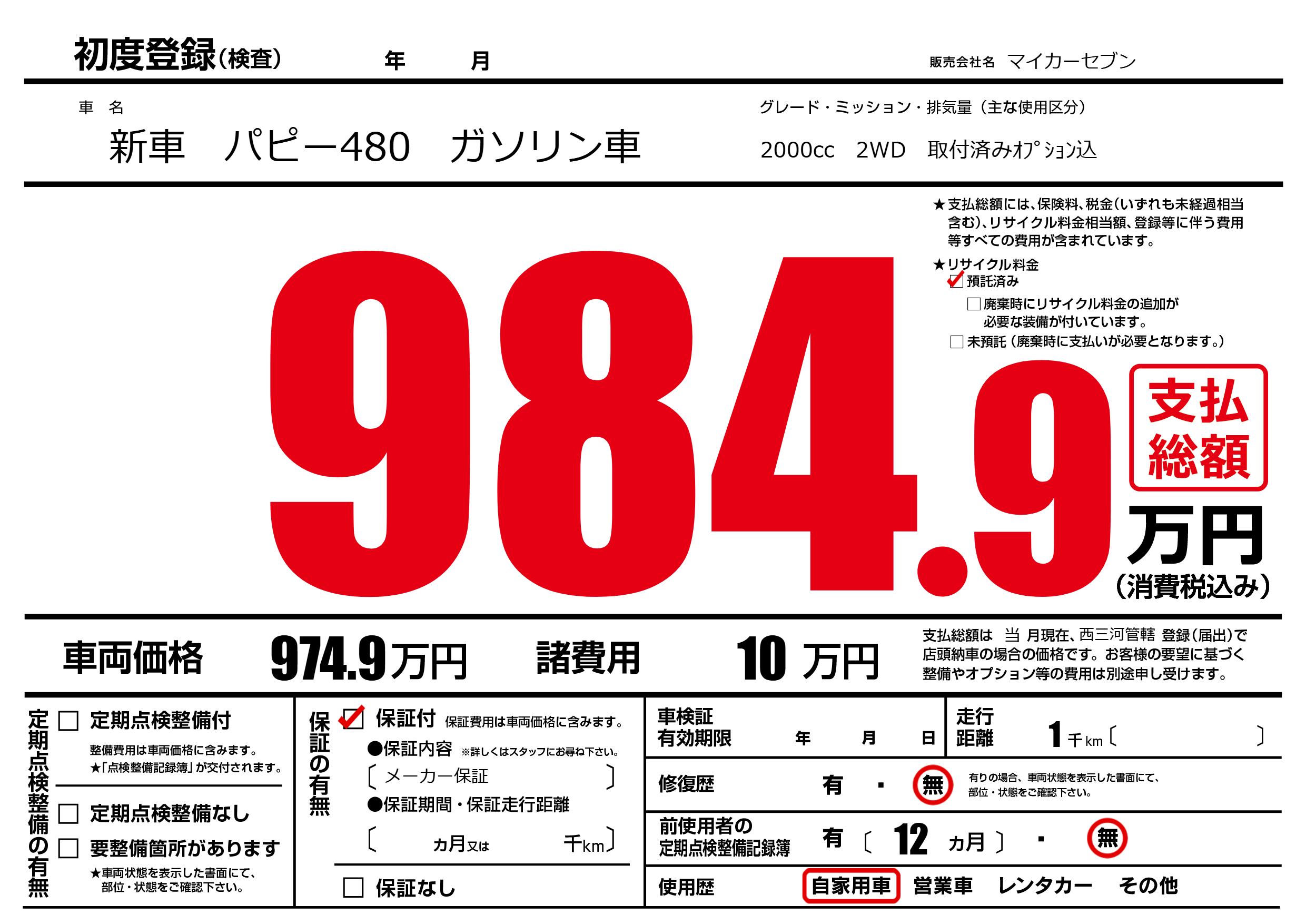 | 車名 | 新車 パピー480 ガソリン車 | グレード ミッション 排気量 |