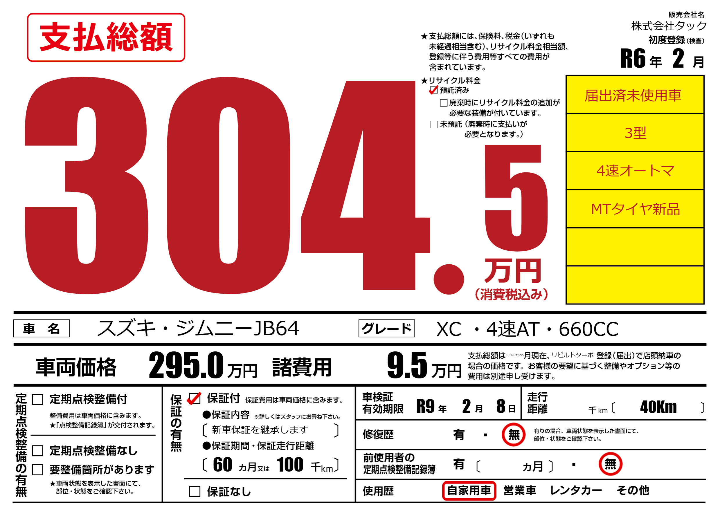 | 車名 | スズキ・ジムニーJB64 | グレード ミッション 排気量 |