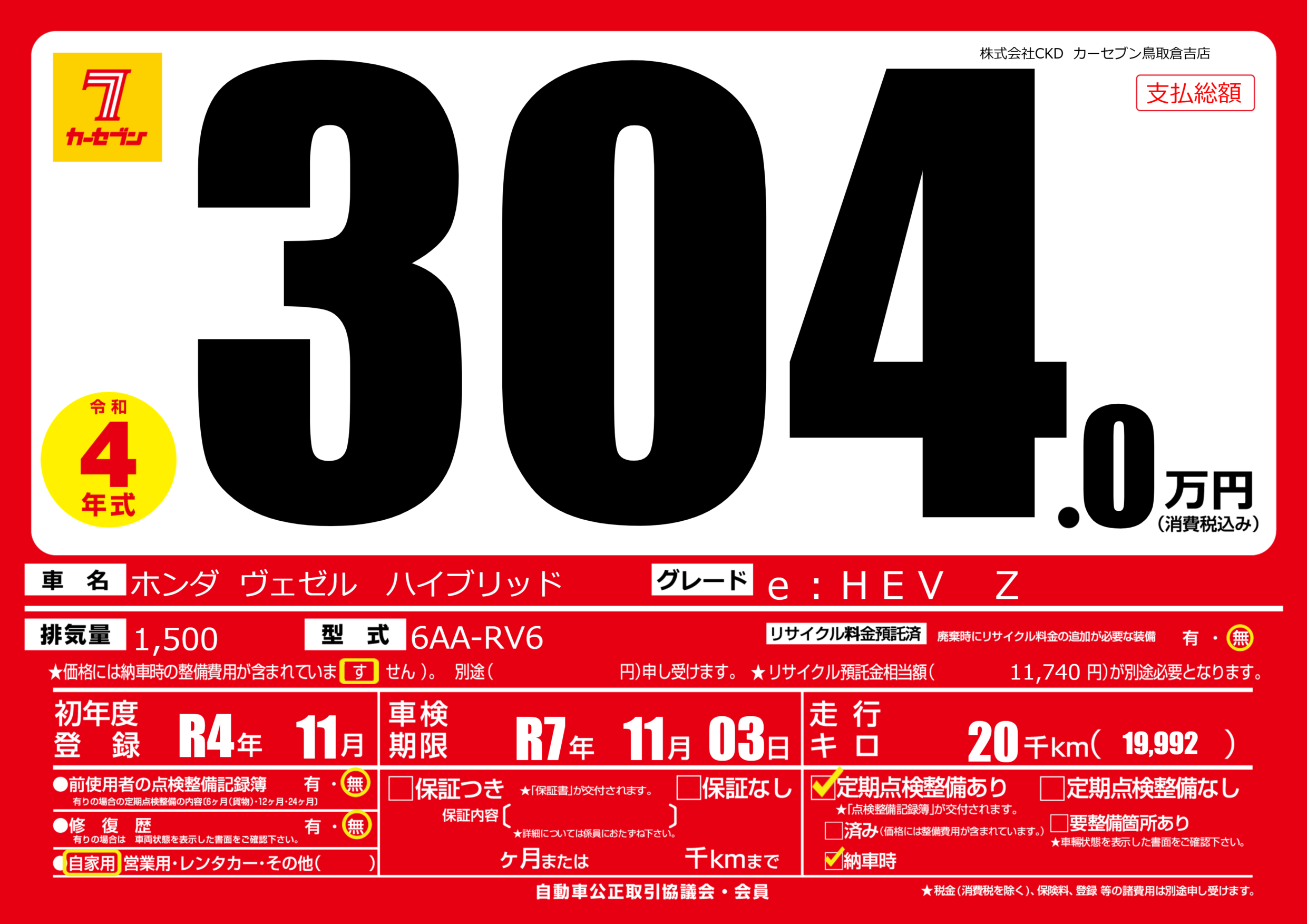 | 走行キロ | 2万km | 初年度登録 | R4年11月 |