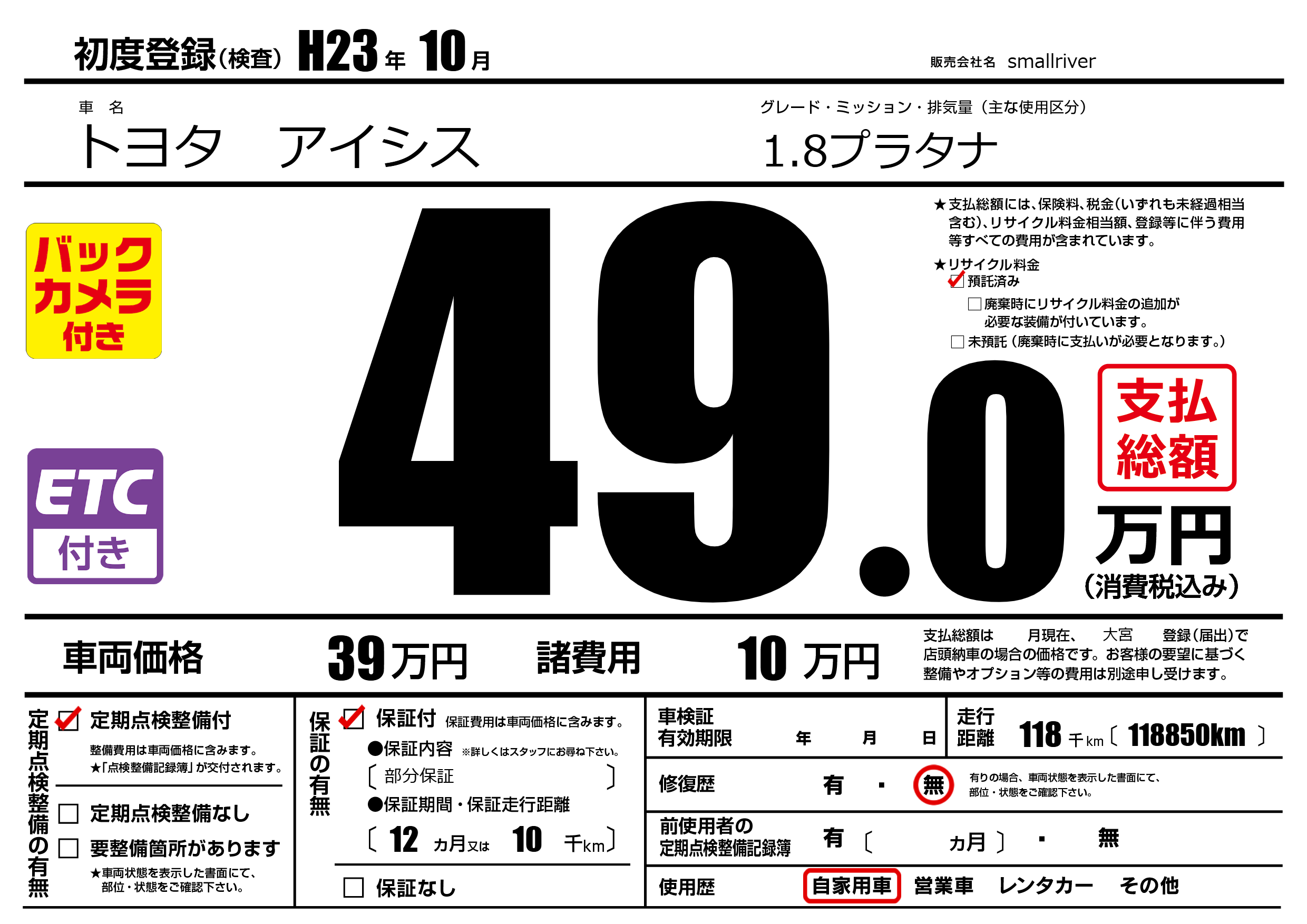 | 走行キロ | 11.8万km | 初年度登録 | H23年10月 |