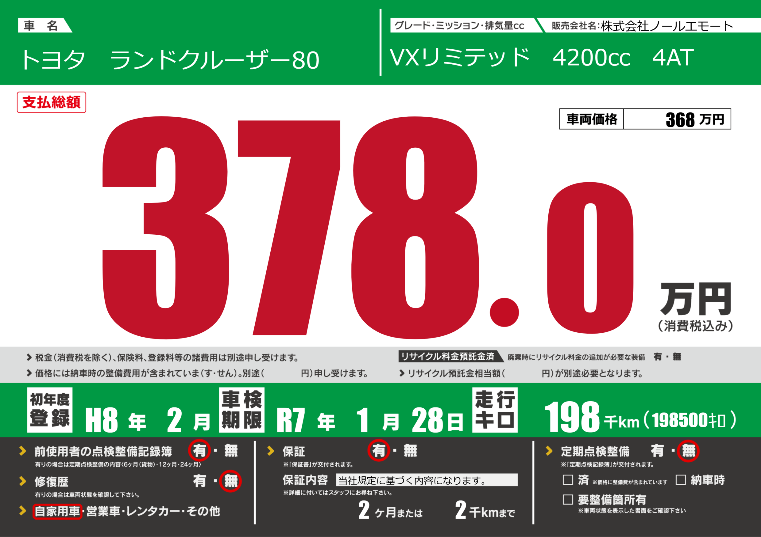 | 車名 | トヨタ ランドクルーザー80 | グレード ミッション 排気量 |