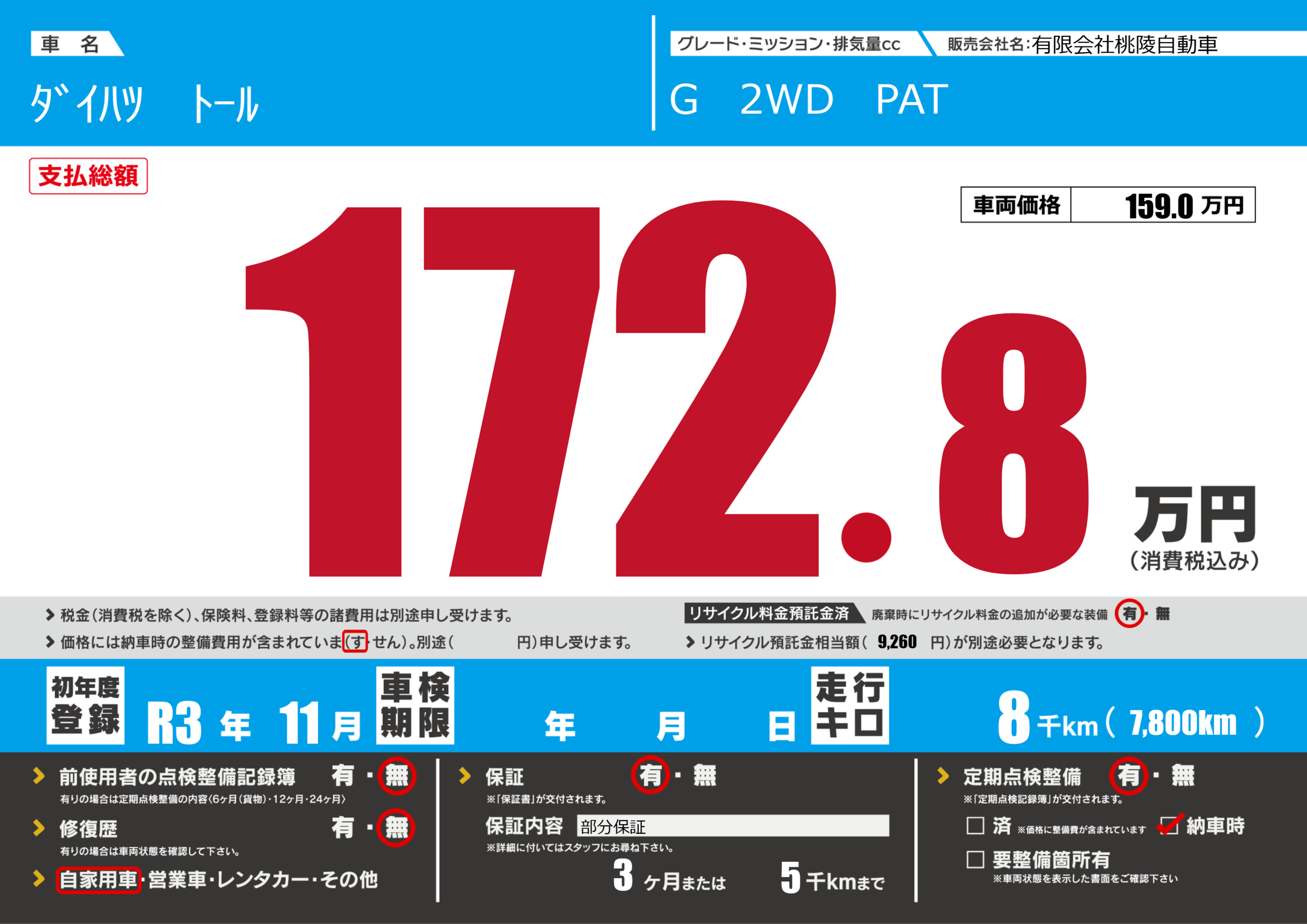 保証付き 保証内容(部分保証) 3ヶ月または(5)千kmまで |