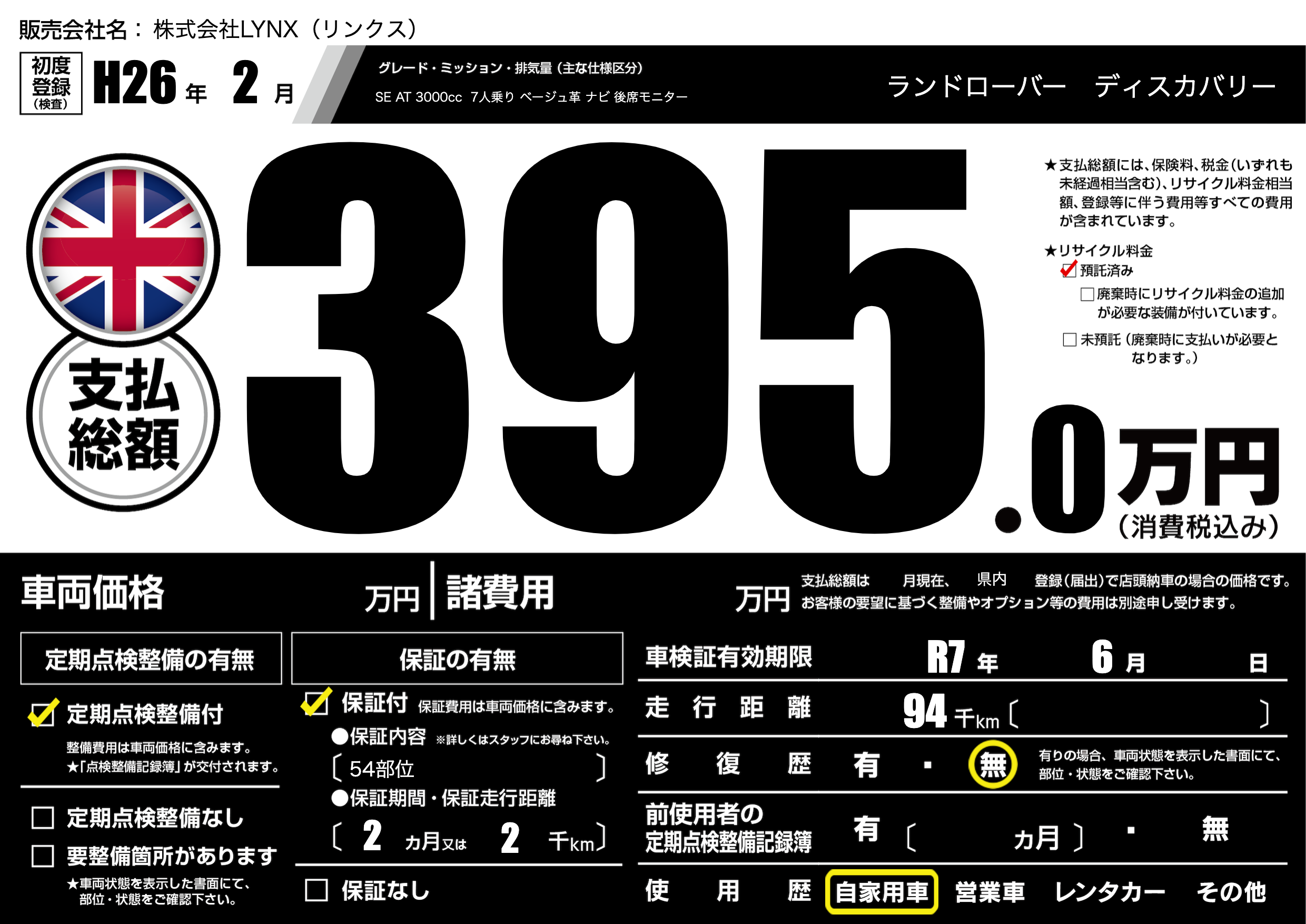 | 車名 | ランドローバー ディスカバリー | グレード ミッション 排気量 |