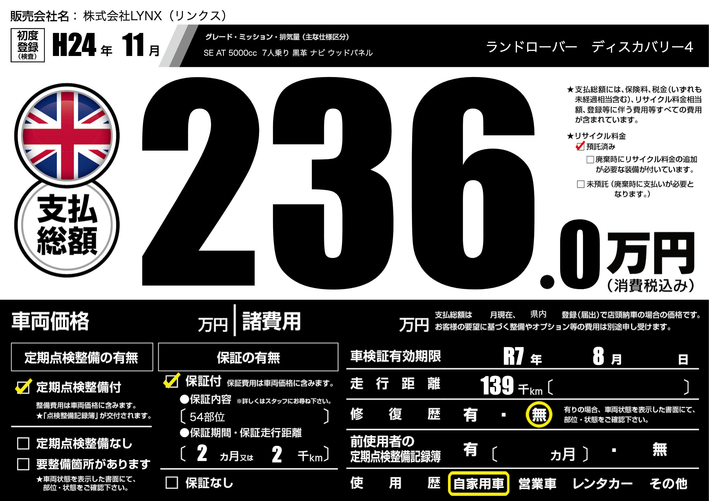 | 車名 | ランドローバー ディスカバリー4 | グレード ミッション 排気量 |