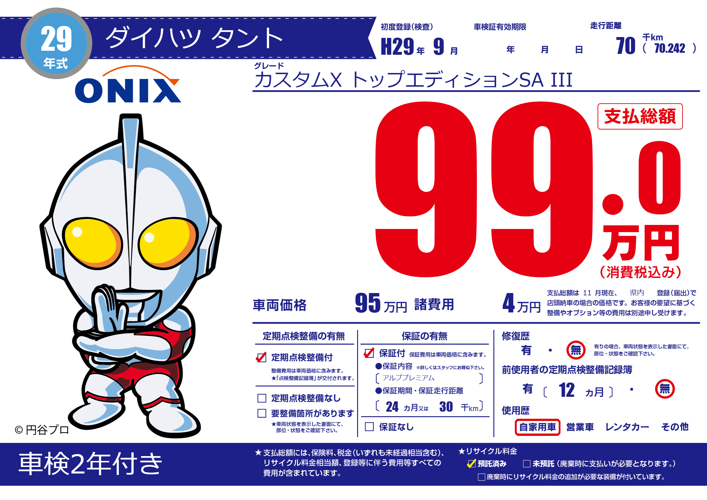 | 車名 | ダイハツ タント | グレード ミッション 排気量 |