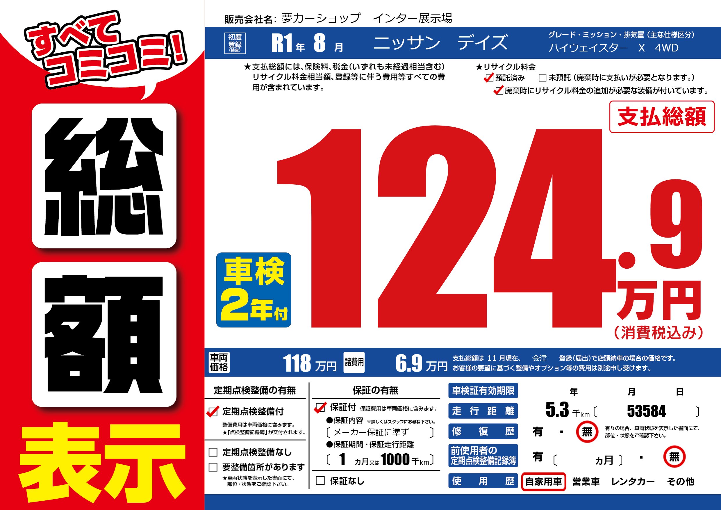 | 車名 | ニッサン デイズ | グレード ミッション 排気量 |