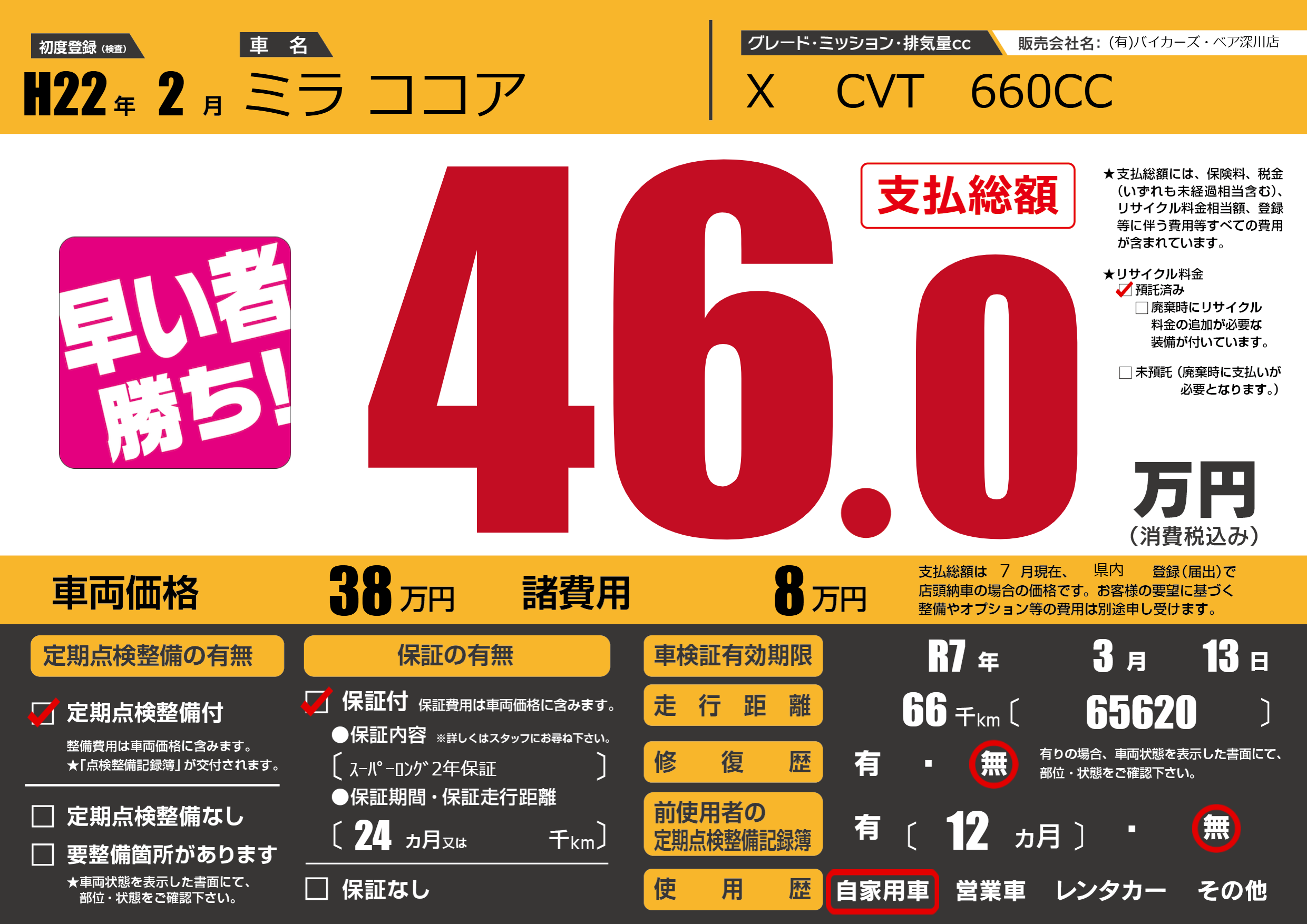 | 走行キロ | 6.6万km | 初年度登録 | H22年2月 |