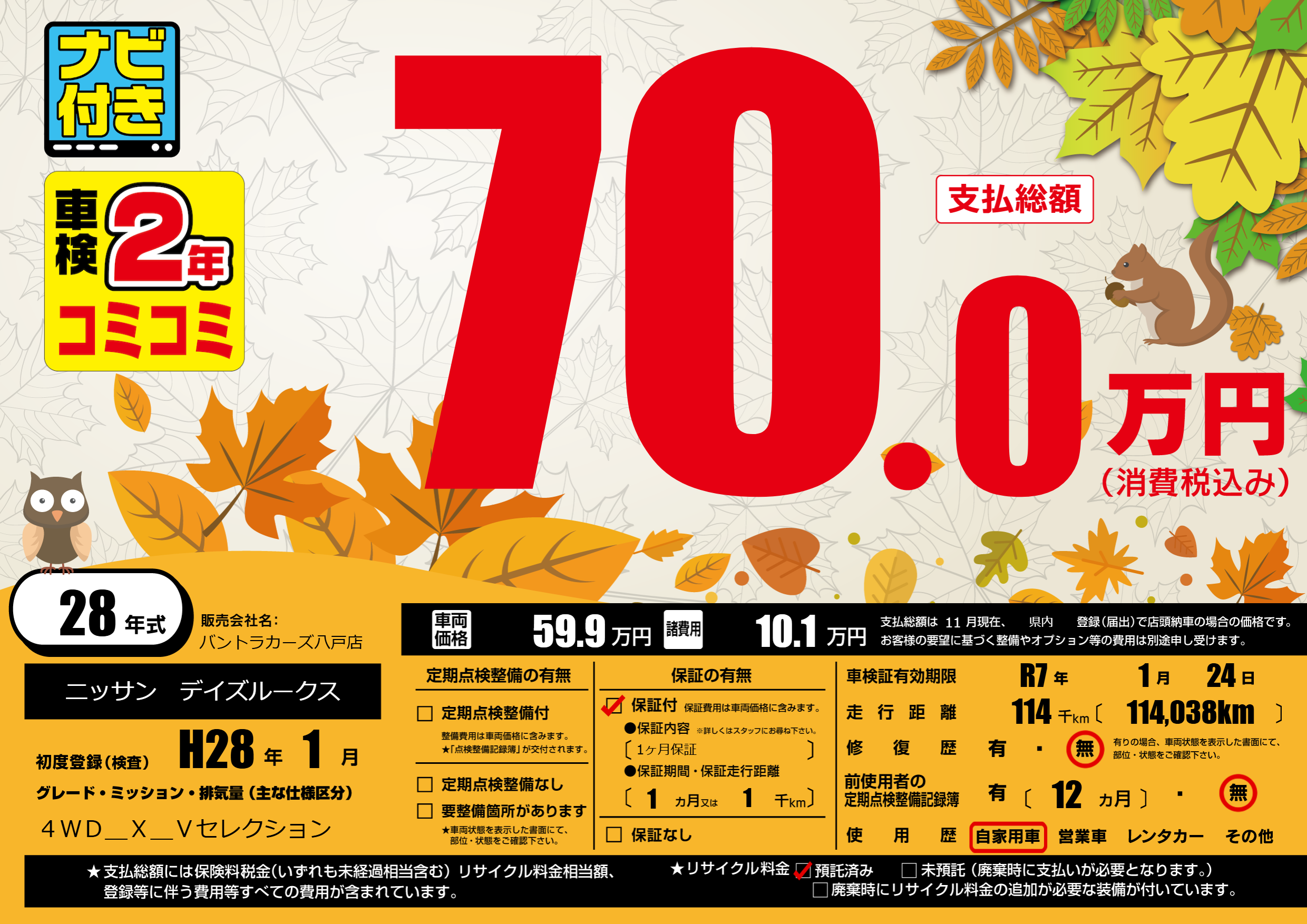 | 車名 | ニッサン デイズルークス | グレード ミッション 排気量 |