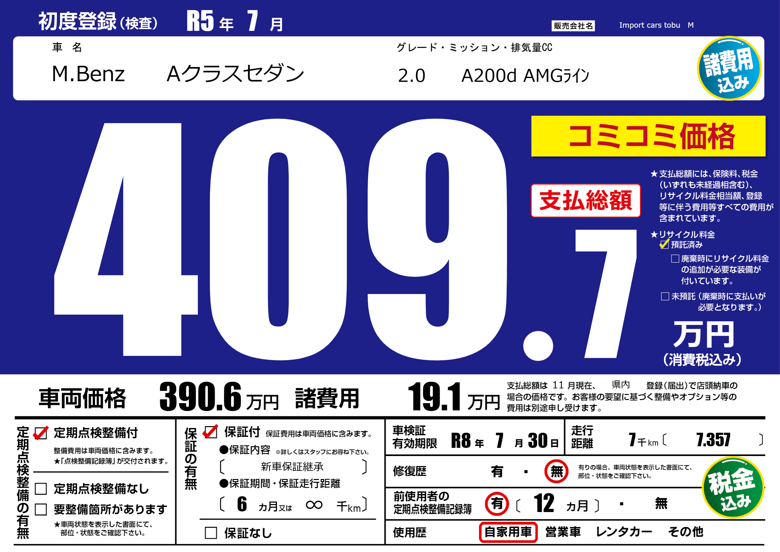 | 車名 | M.Benz Aクラスセダン | グレード ミッション 排気量 |
