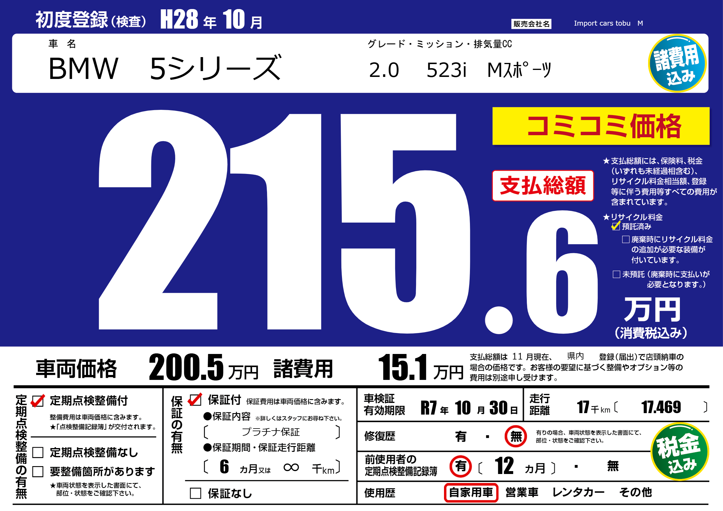 | 車名 | BMW 5シリーズ | グレード ミッション 排気量 |