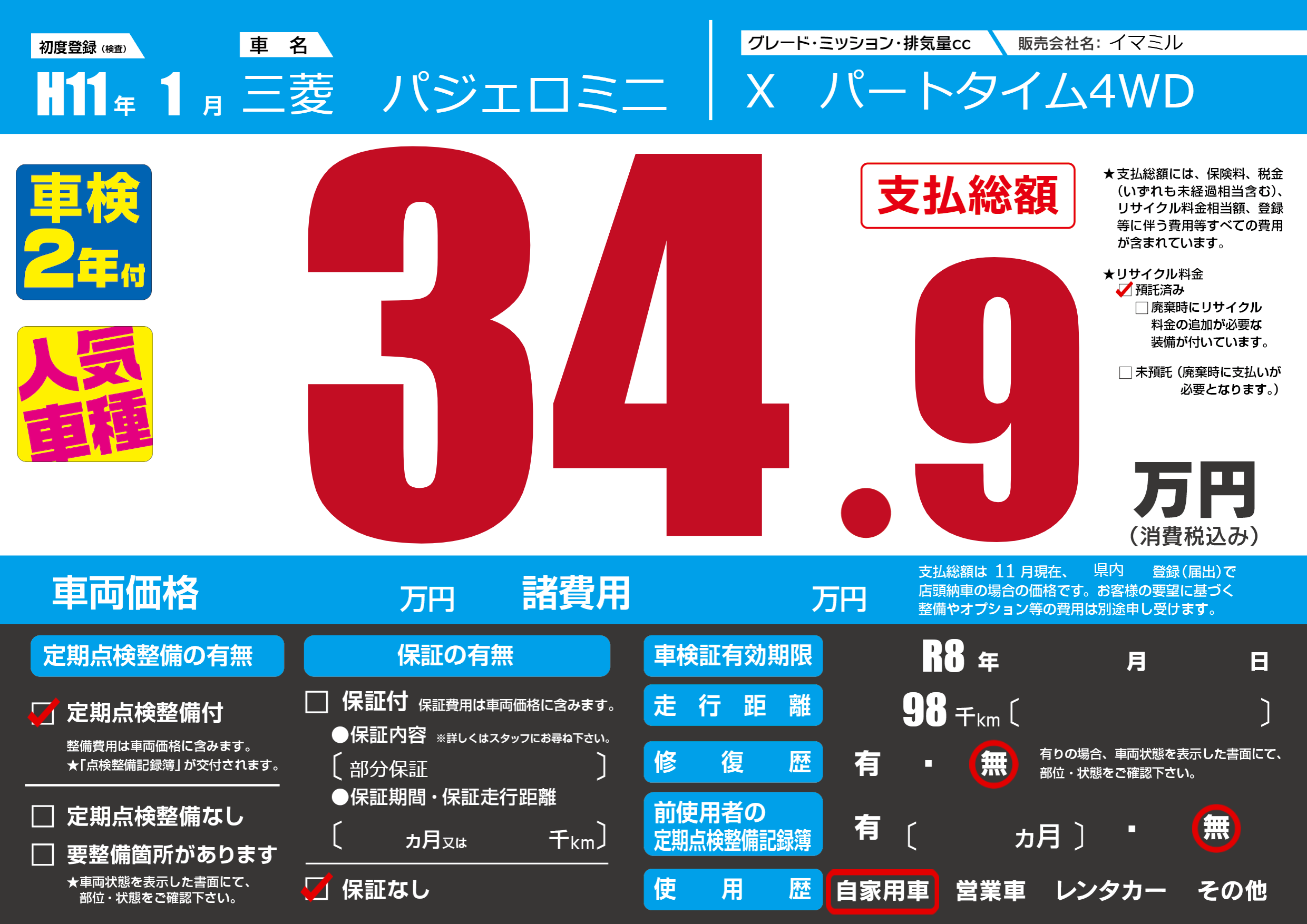 | 車名 | 三菱 パジェロミニ | グレード ミッション 排気量 |