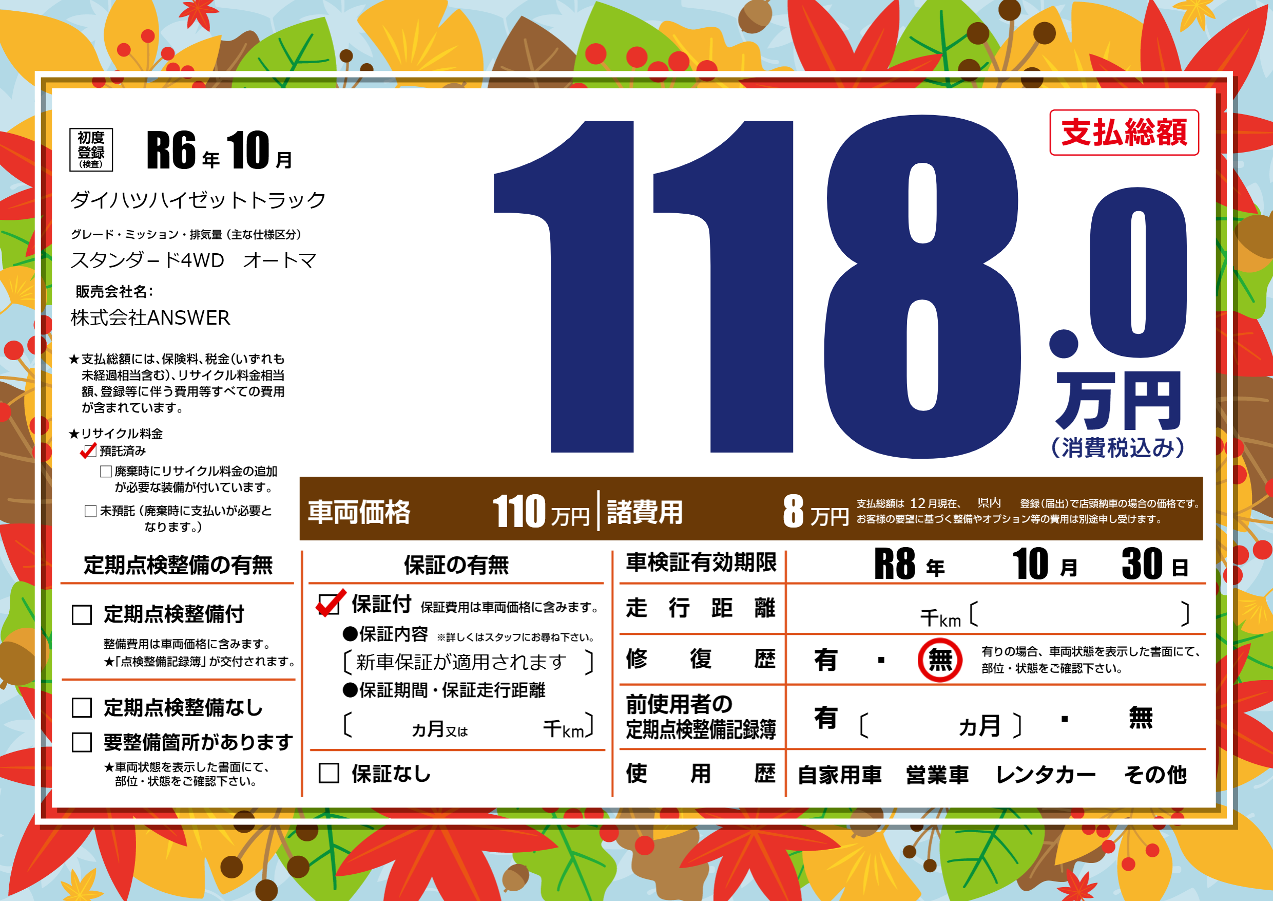保証付き 保証内容(新車保証が適用されます) ---ヶ月または()千kmまで |