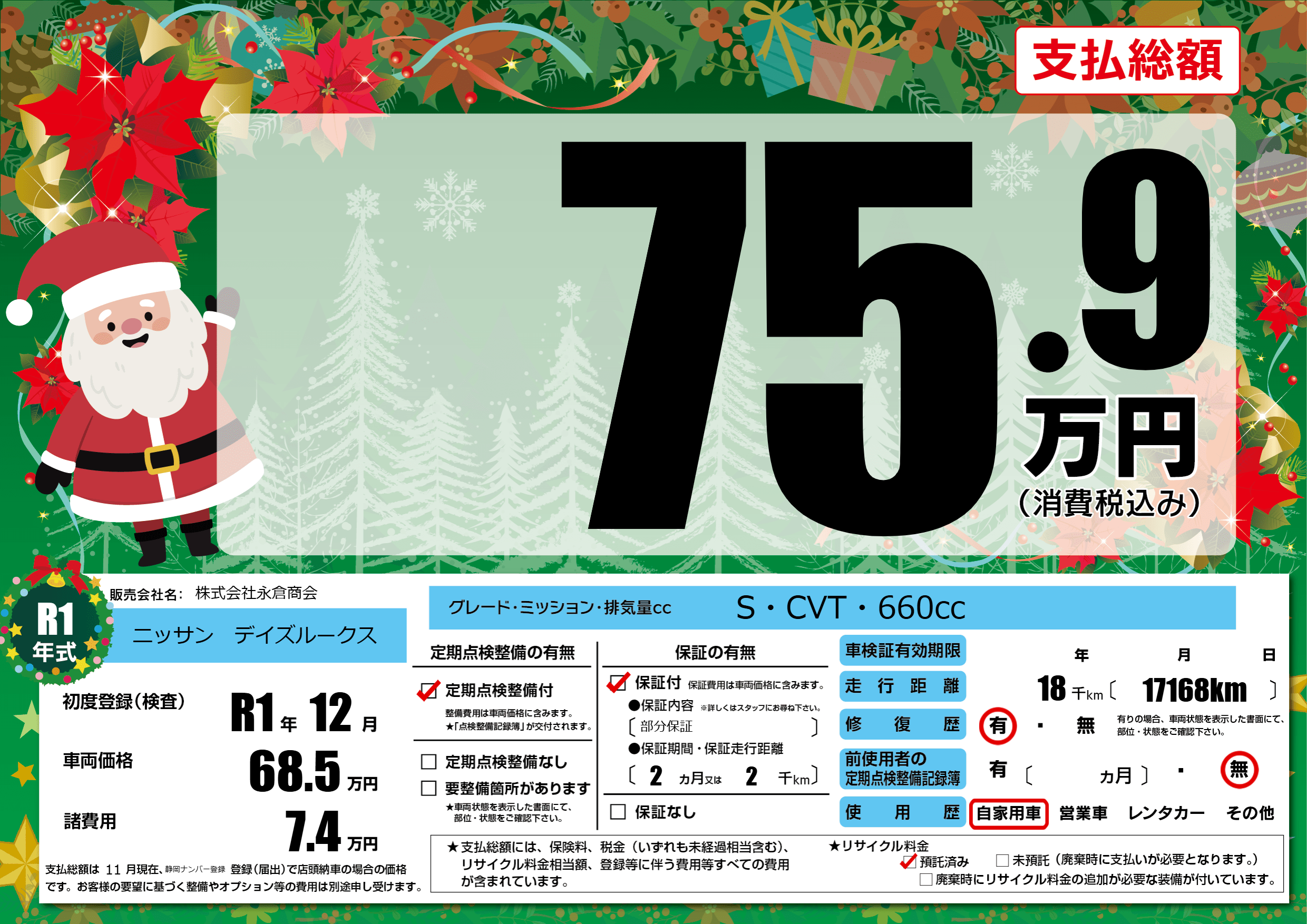 | 車名 | ニッサン デイズルークス | グレード ミッション 排気量 |