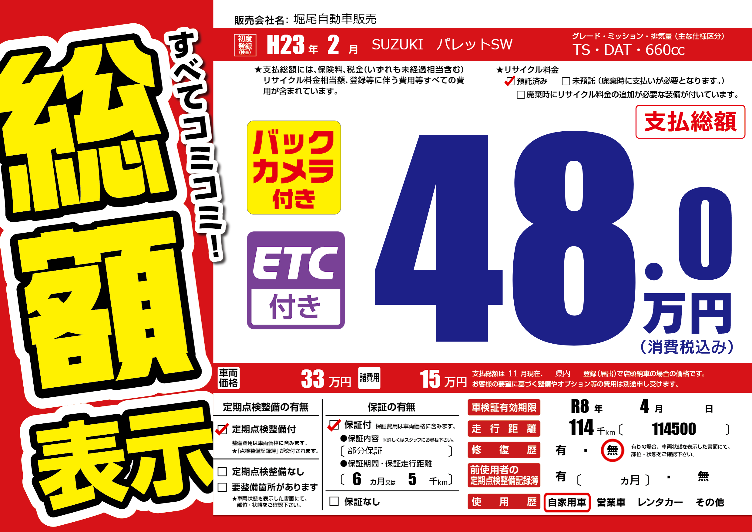 | 車名 | SUZUKI パレットSW | グレード ミッション 排気量 |