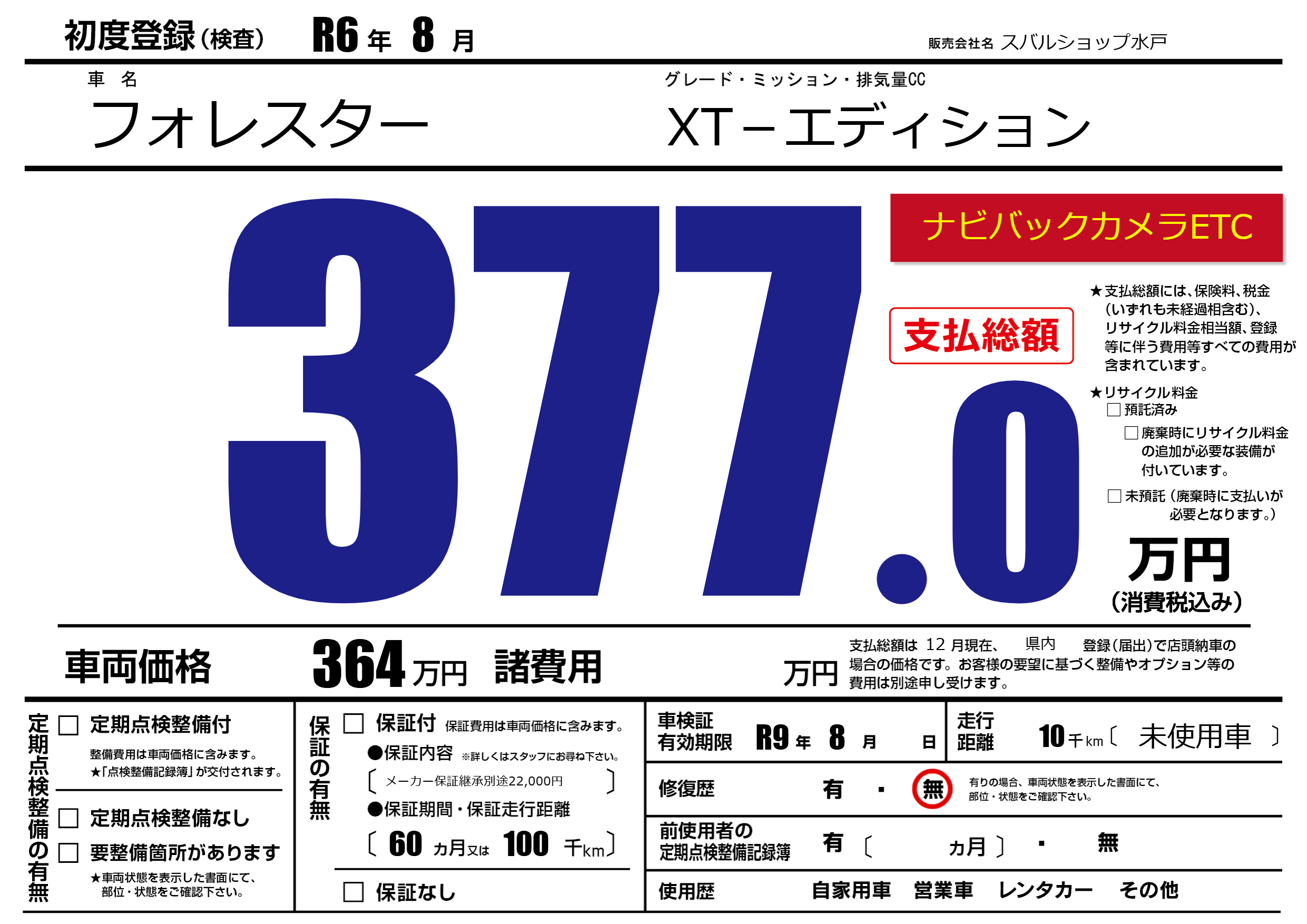 | 車名 | フォレスター | グレード ミッション 排気量 |