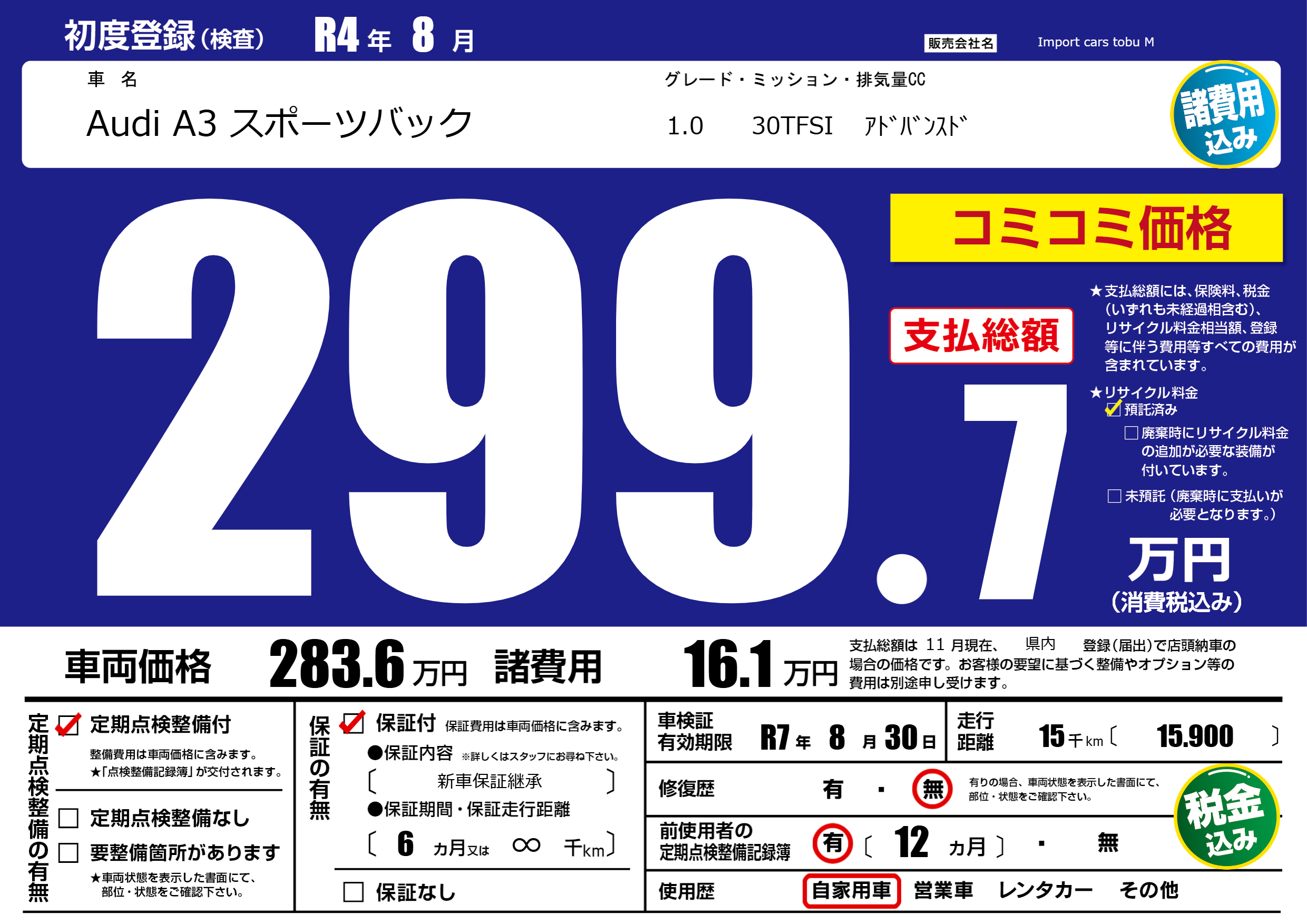 | 車名 | Audi A3 スポーツバック | グレード ミッション 排気量 |