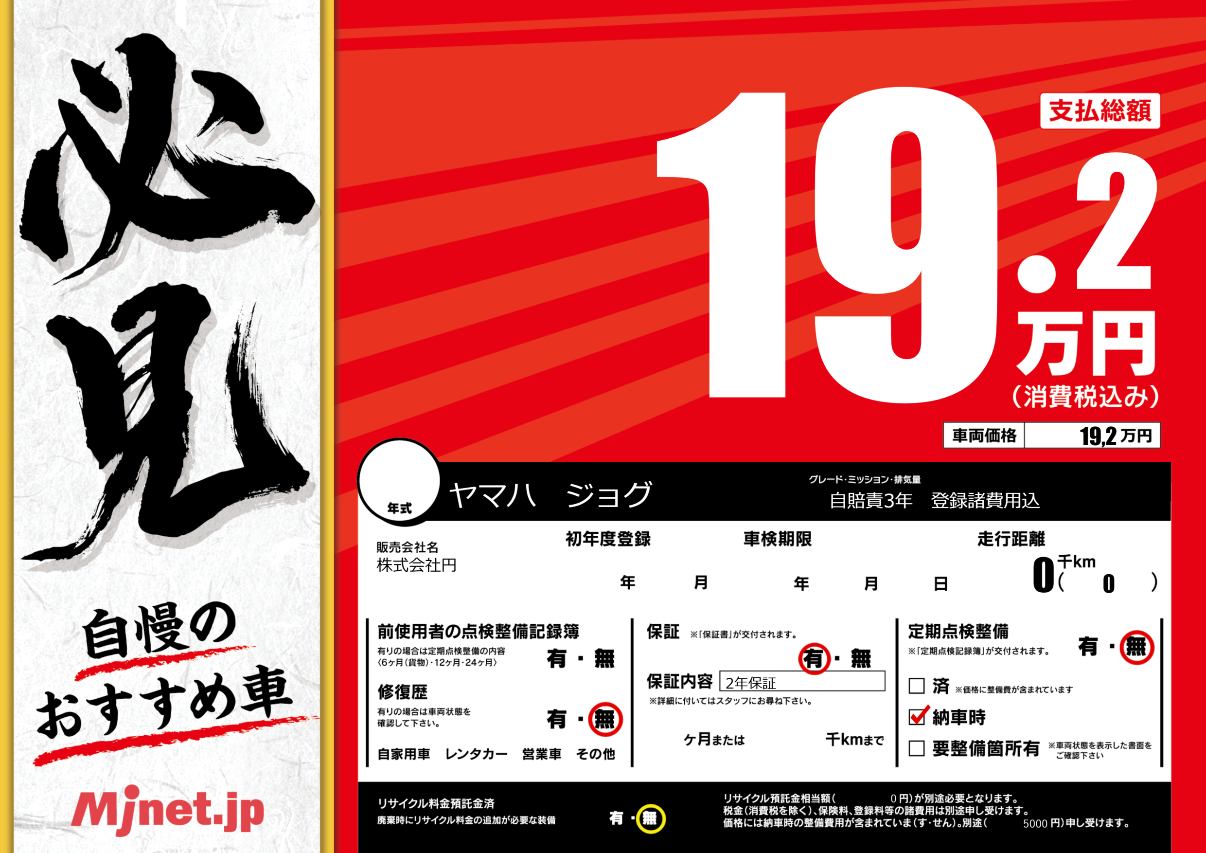 | 車名 | ヤマハ ジョグ | グレード ミッション 排気量 |