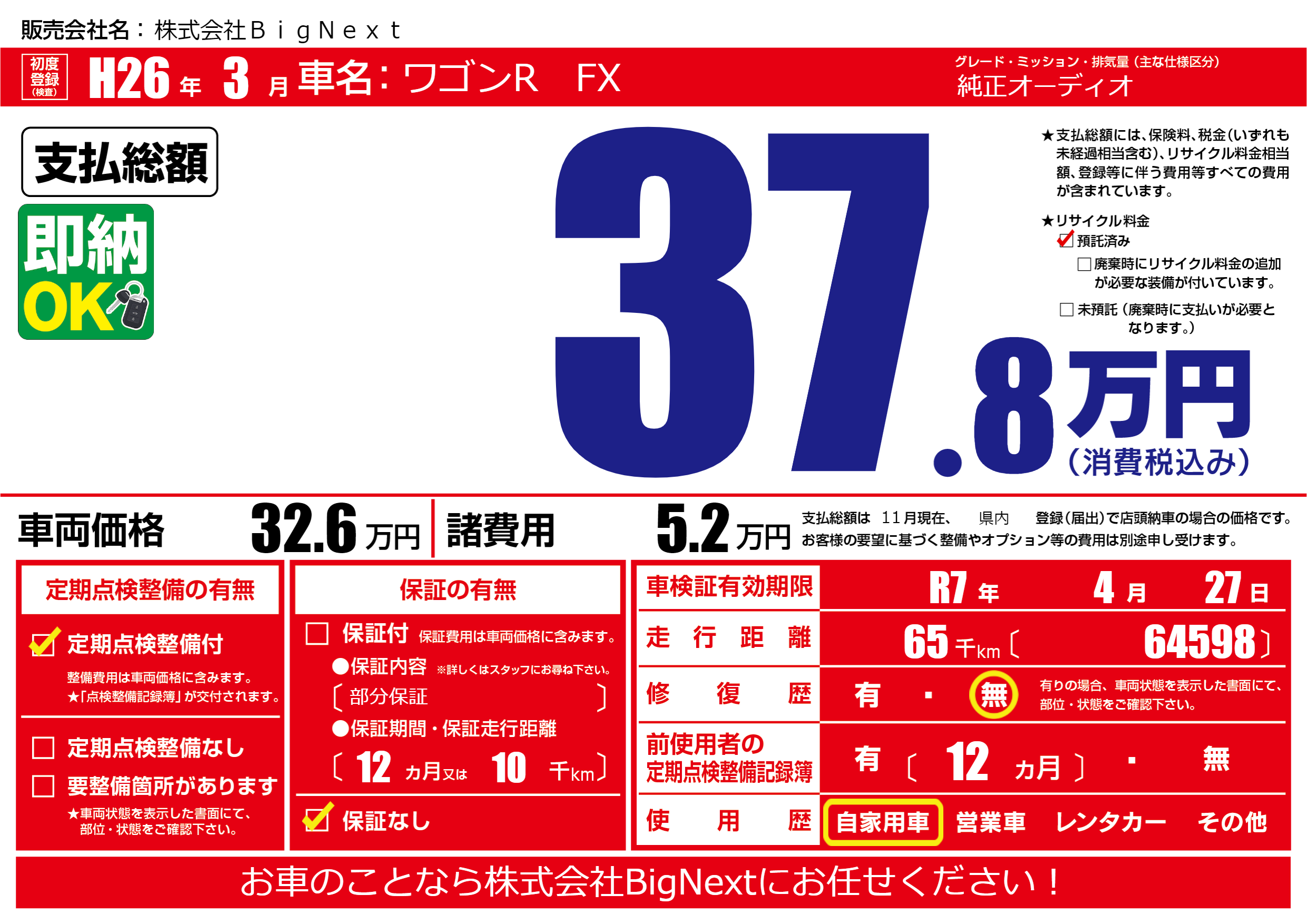 | 車名 | ワゴンR FX | グレード ミッション 排気量 |