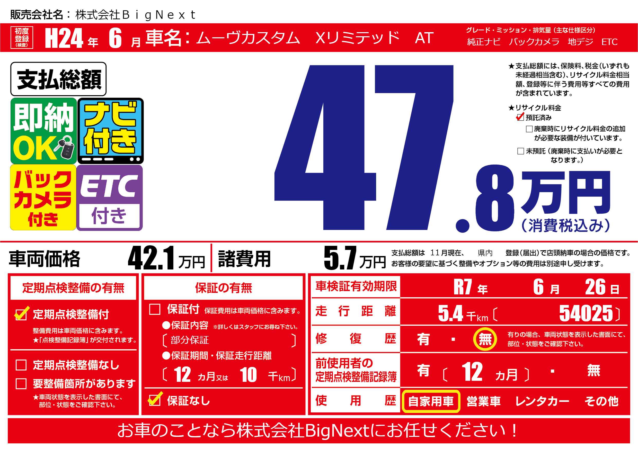 | 走行キロ | 0.5万km | 初年度登録 | H24年6月 |