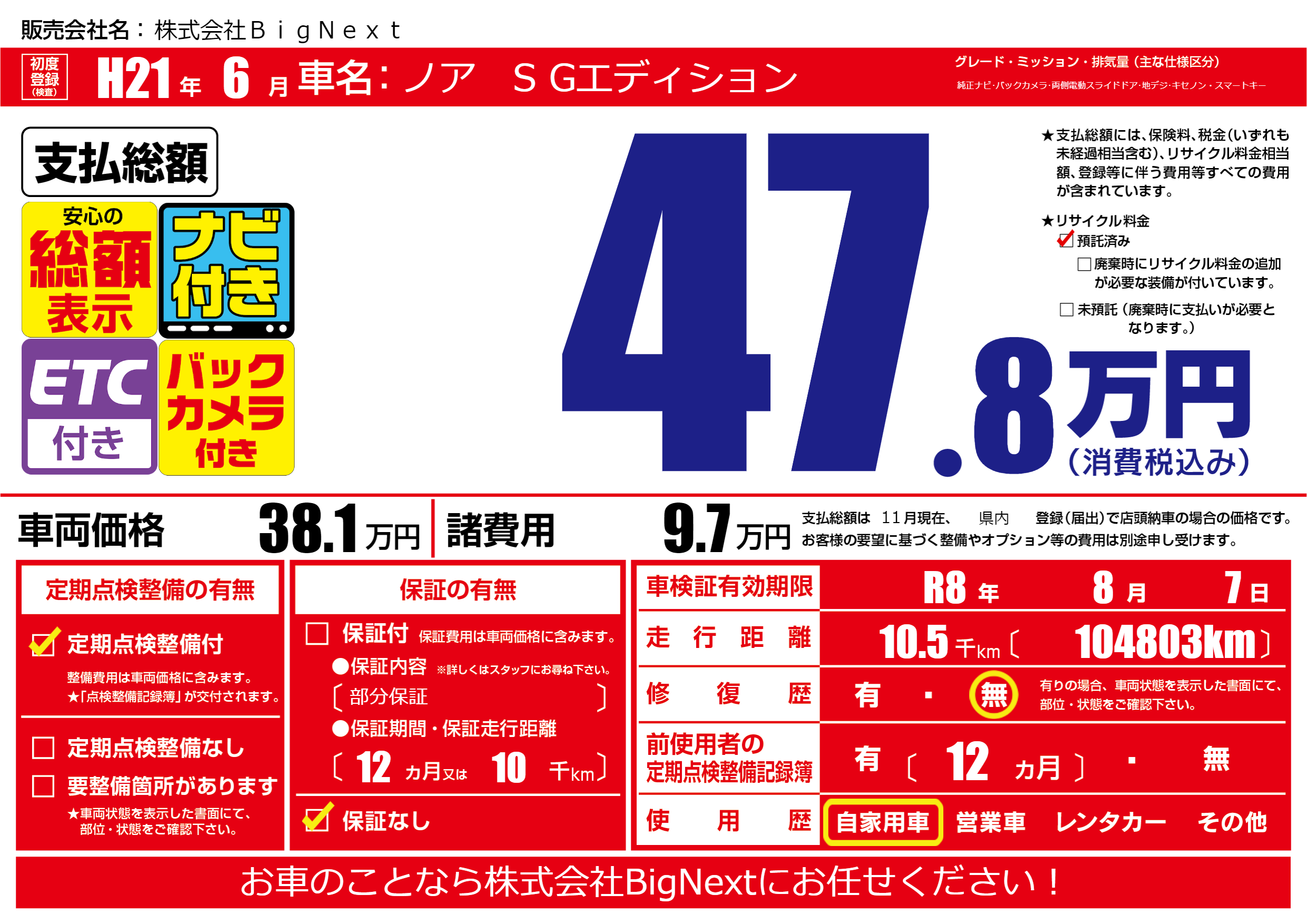 | 走行キロ | 1万km | 初年度登録 | H21年6月 |
