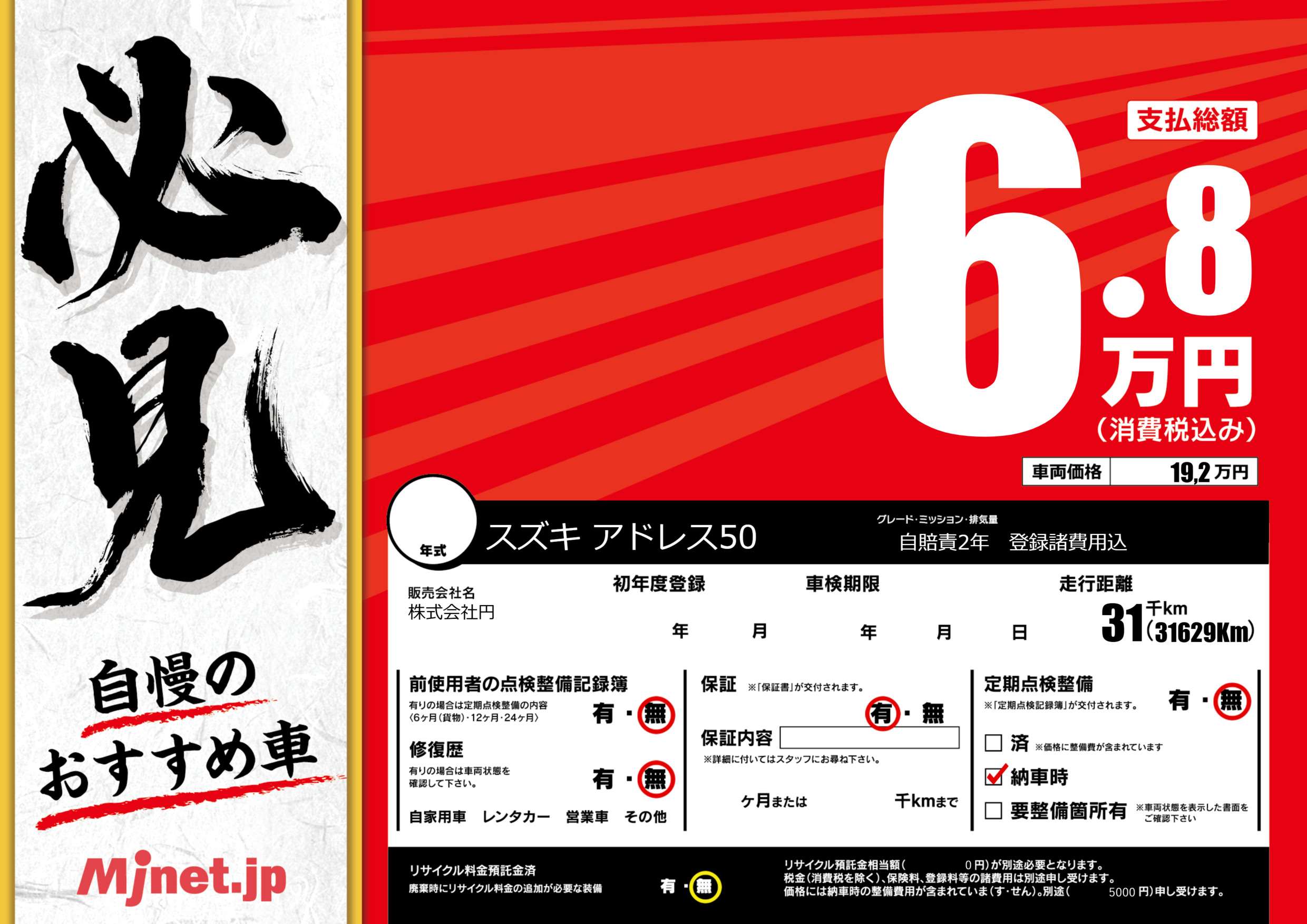 | 車名 | スズキ アドレス50 | グレード ミッション 排気量 |