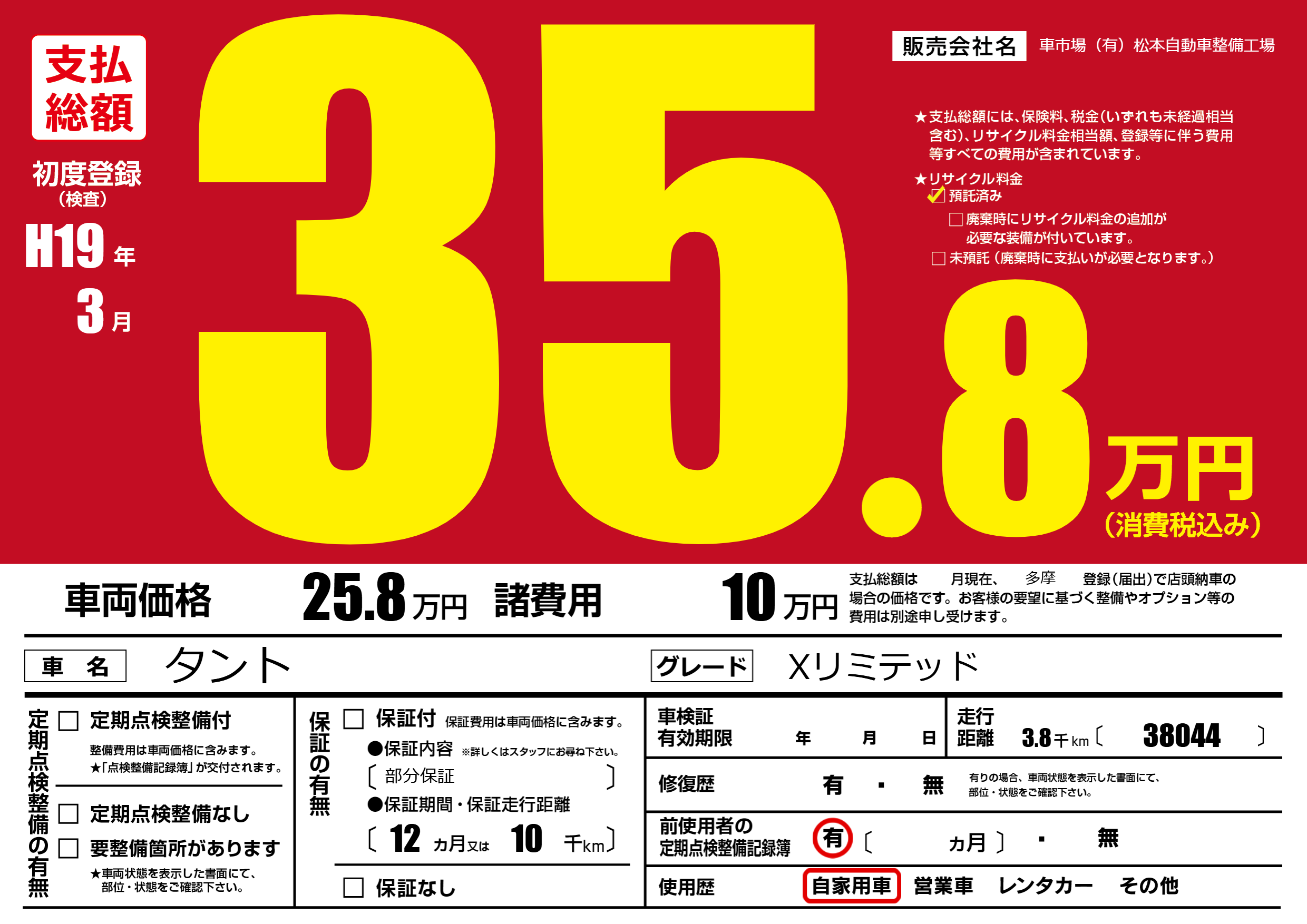 | 走行キロ | 0.3万km | 初年度登録 | H19年3月 |